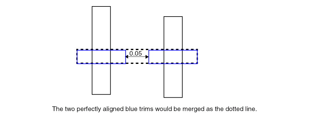 Specifies that perfectly aligned trims with spacing/gap length less than or equal to trimGapLength should be merged. Only same-mask trims can be merged. No trim spacing check would be applied among the merged trims. Merged trims would still check spacing against other trims as usual.