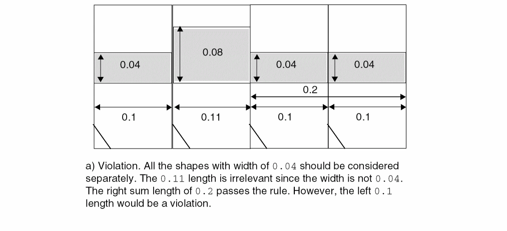 The shapes must be a rectangle with width measured in the preferred routing layer on TRIMMEDMETAL exactly equal to exactWidth and length measured in the orthogonal direction less than or equal to maxLength, if specified. Shapes are always formed at the line-end of wires on TRIMMEDMETAL. The ‘width’ dimension is always sandwiched between two line-end wires along the preferred direction on TRIMMEDMETAL.