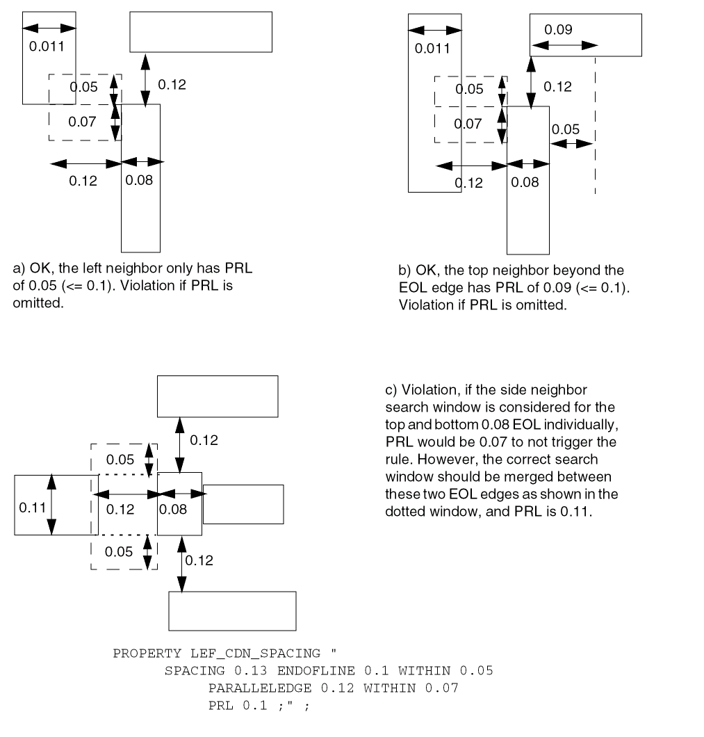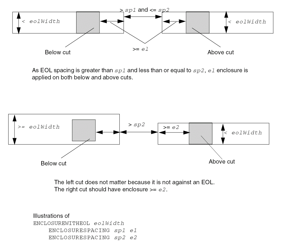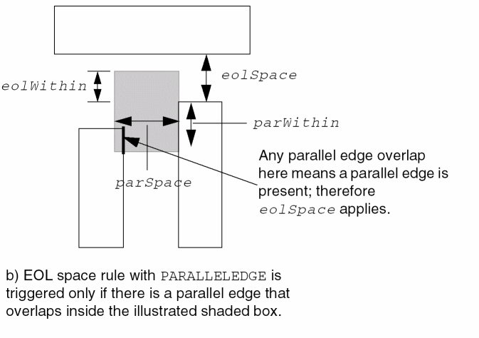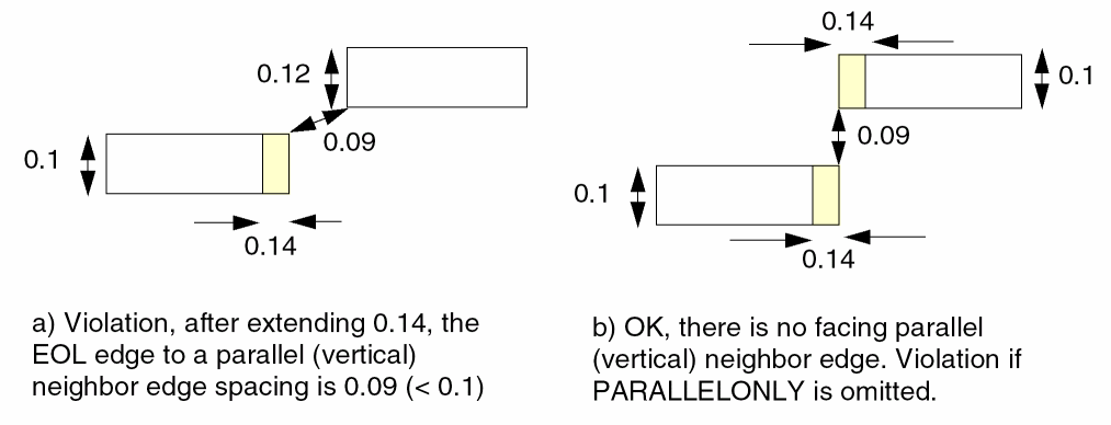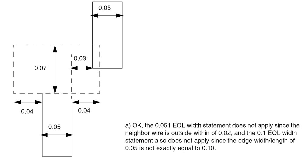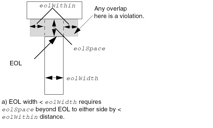 Specifies that the parallel run length table does not apply to EOL edges with width less than eolWidth. Those EOL edges should follow the |