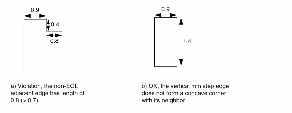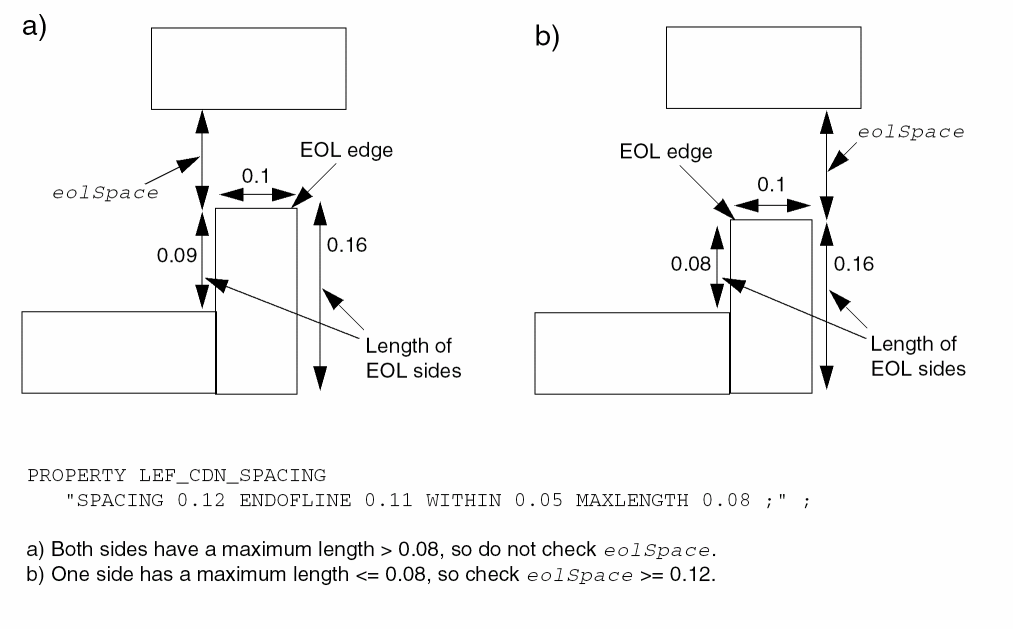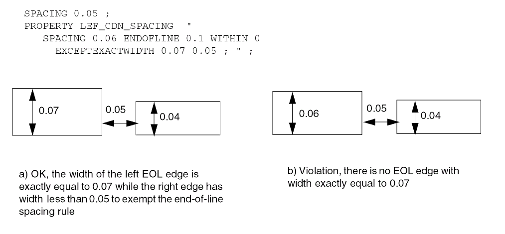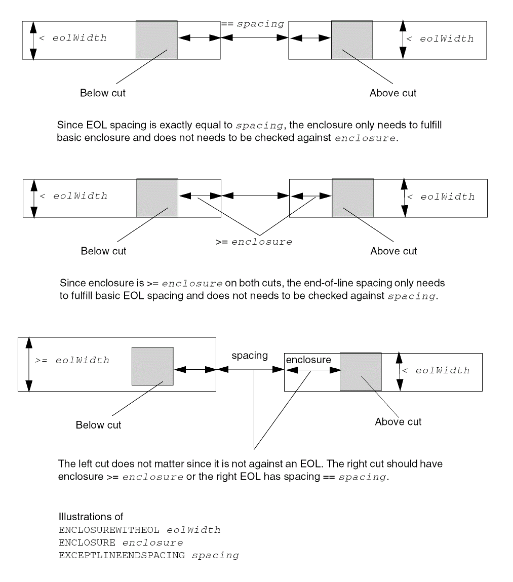 Specifies that the parallel run length table does not apply to EOL edges with width less than eolWidth. Those EOL edges should follow the |
