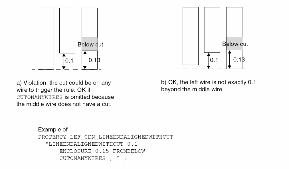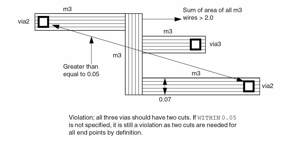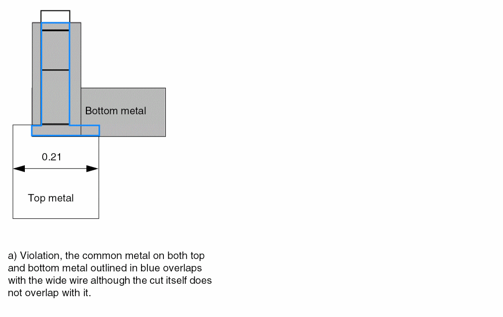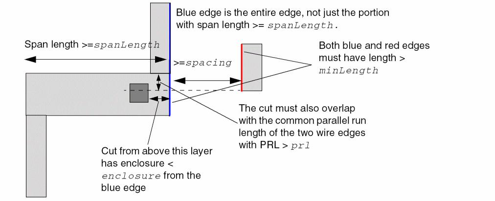 The following example indicates the same as above, except that the spacing is between wires in metal layer to all cut vias in the adjacent above and below cut layers: