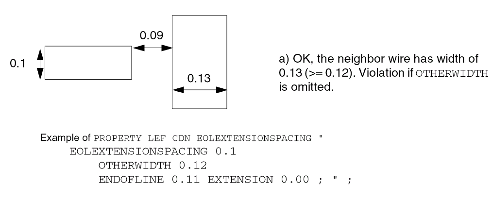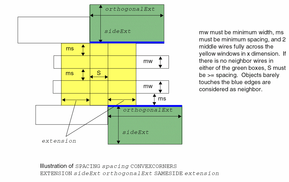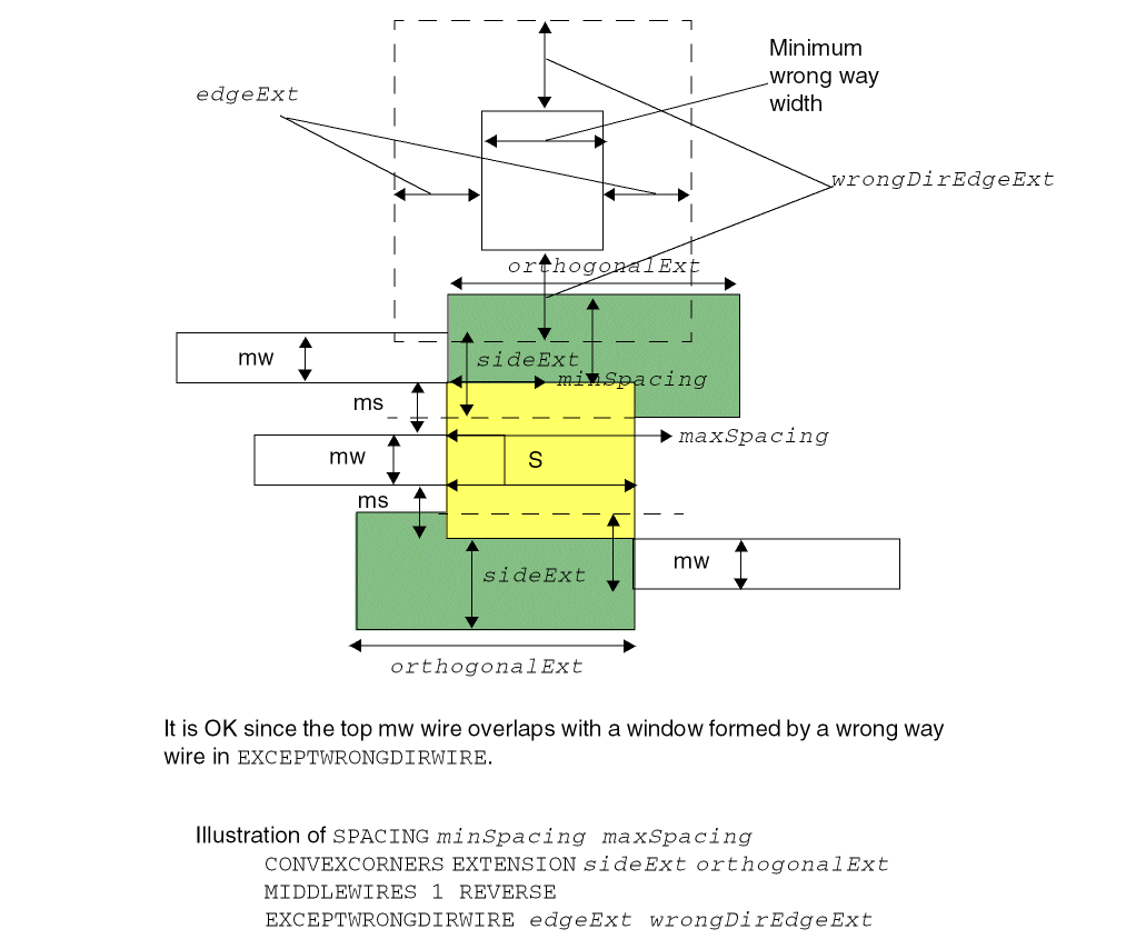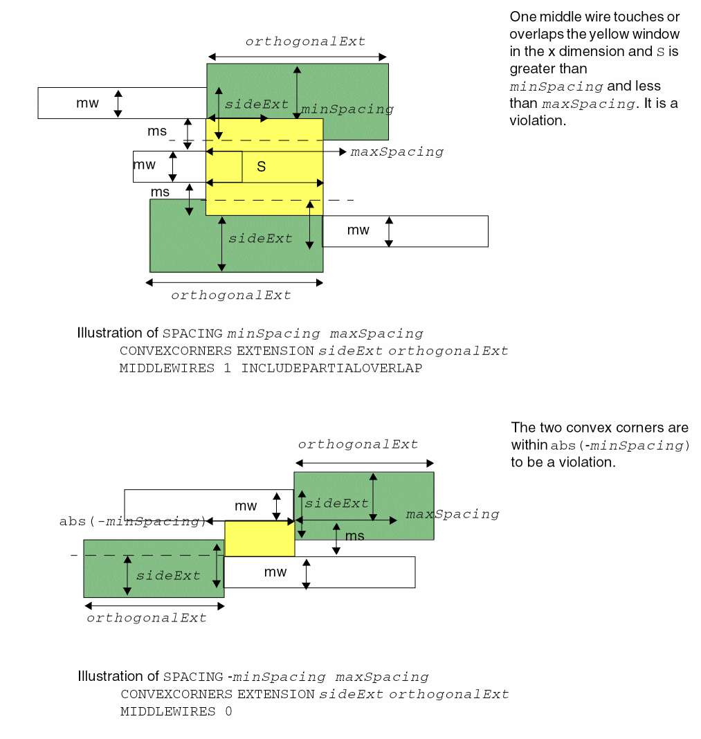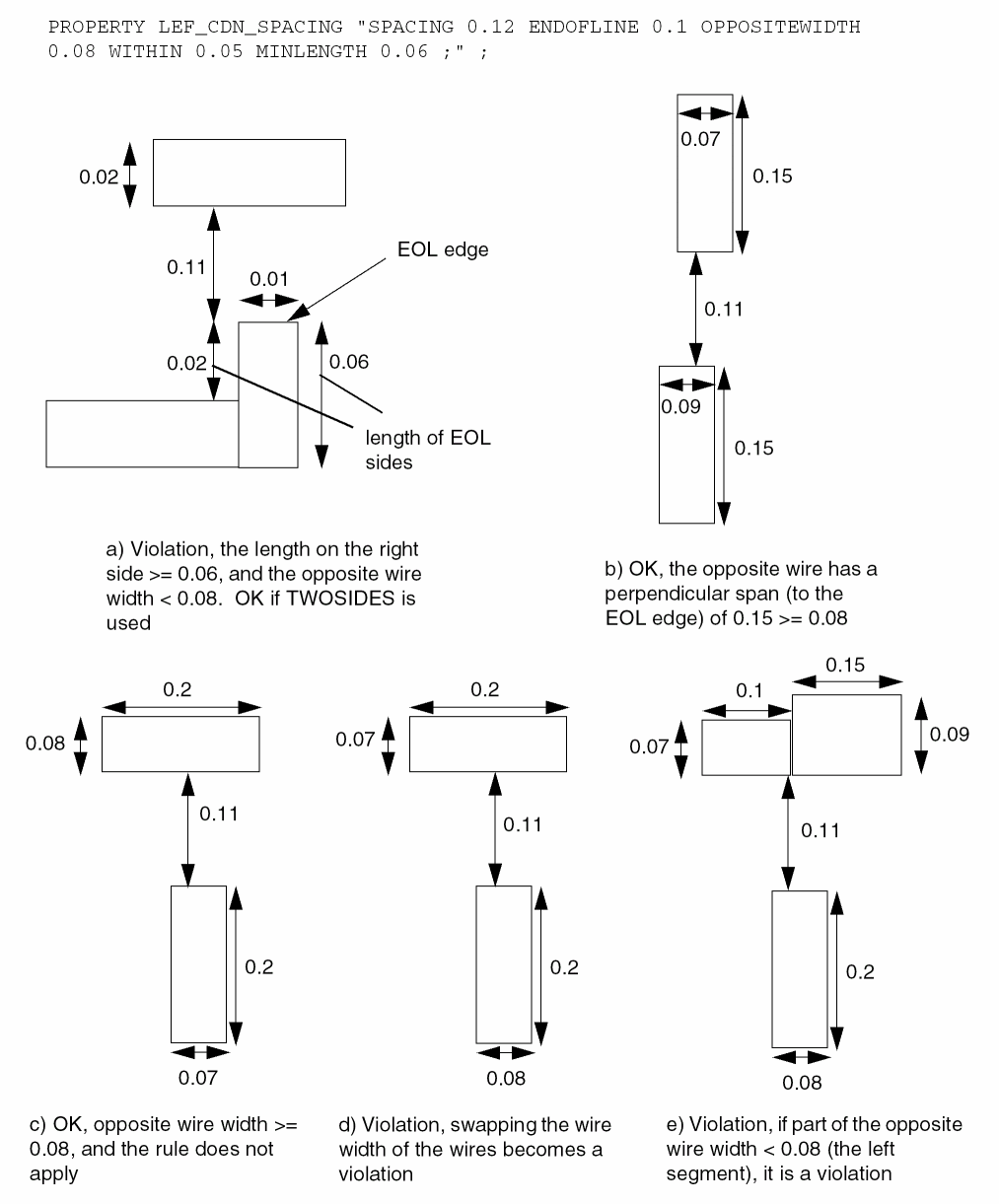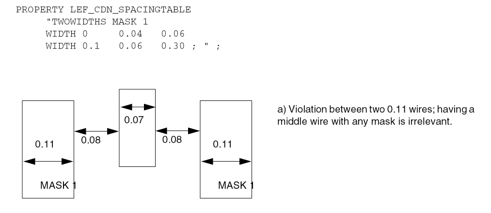 PROPERTY LEF_CDN_TWOWIRESFORBIDDENSPACING "TWOWIRESFORBIDDENSPACING [SAMEMASK | MASKmaskNum] {minSpacing maxSpacing}... [HORIZONTAL|VERTICAL] [IGNOREMIDDLE] { MINSPANLENGTHminSpanLength[EXACTSPANLENGTH] MAXSPANLENGTHmaxSpanLength[EXACTSPANLENGTH] |FIRSTSPANLENGTHspanLength1 spanLength2[OTHERSPANLENGTHotherSpanLength1] SECONDSPANLENGTHspanLength3 spanLength4} [OTHERSPANLENGTHotherSpanLength2] |OFFGRIDONLYminWidth1 maxWidth1[minWidth2 maxWidth2] } PRLprl; “ ;