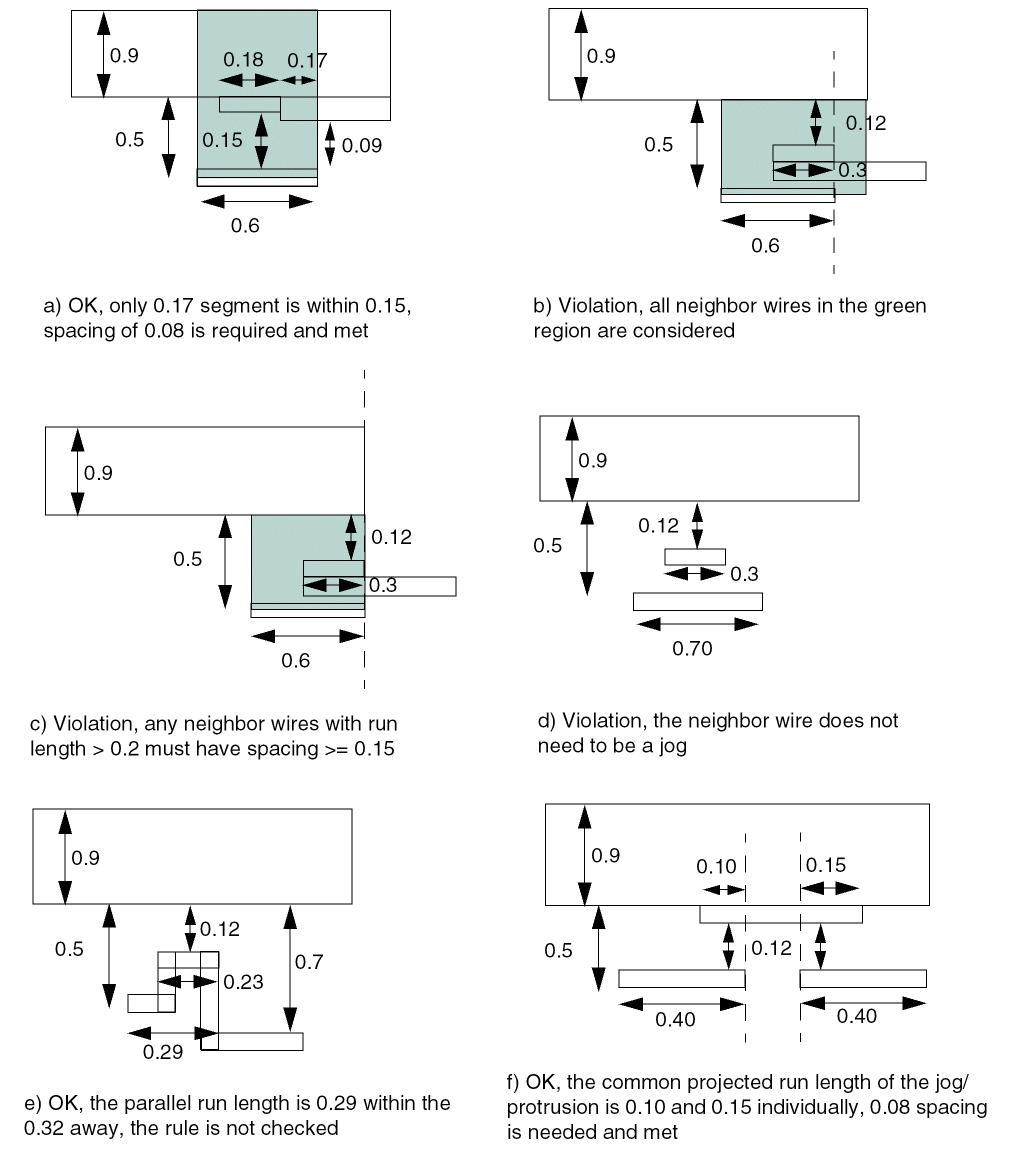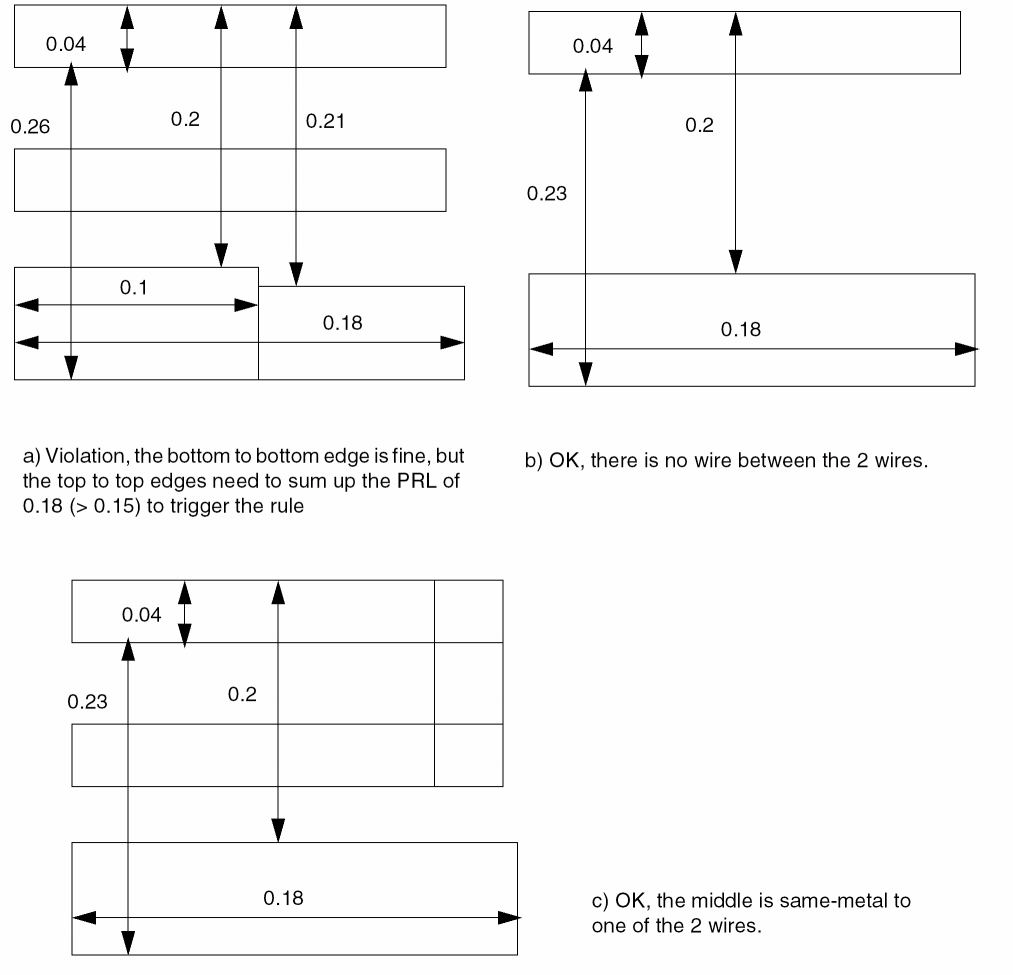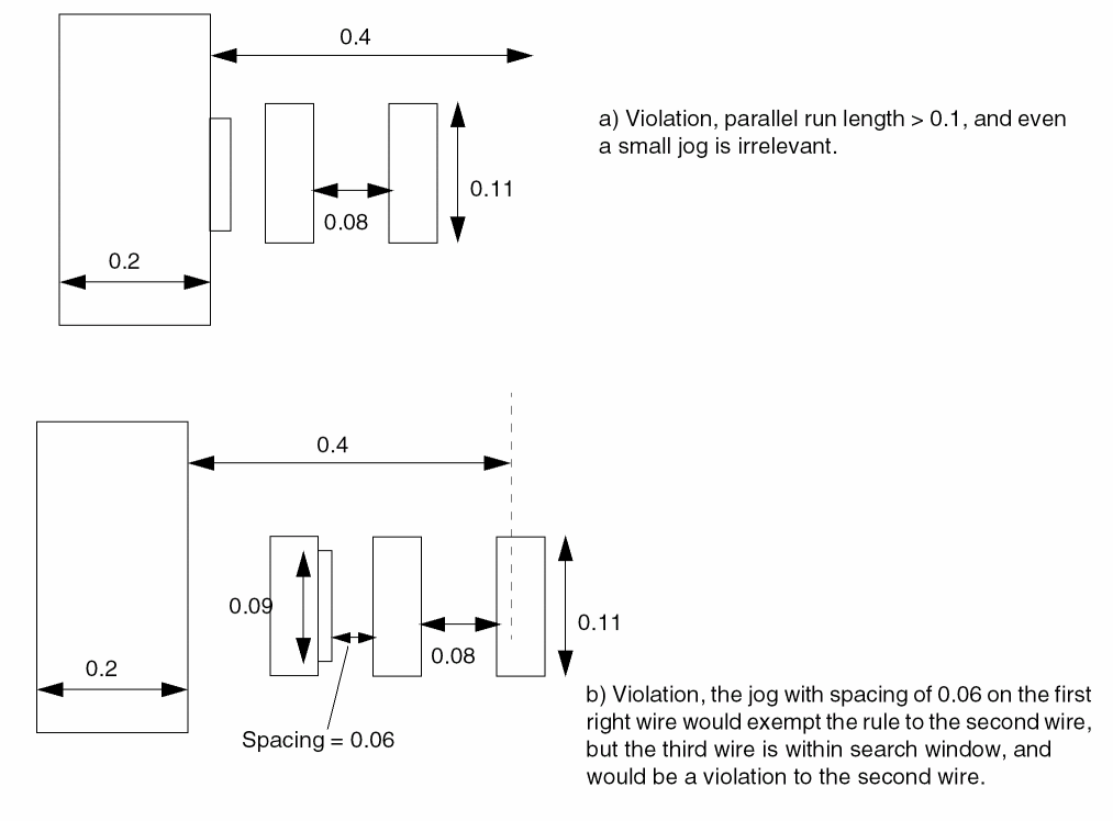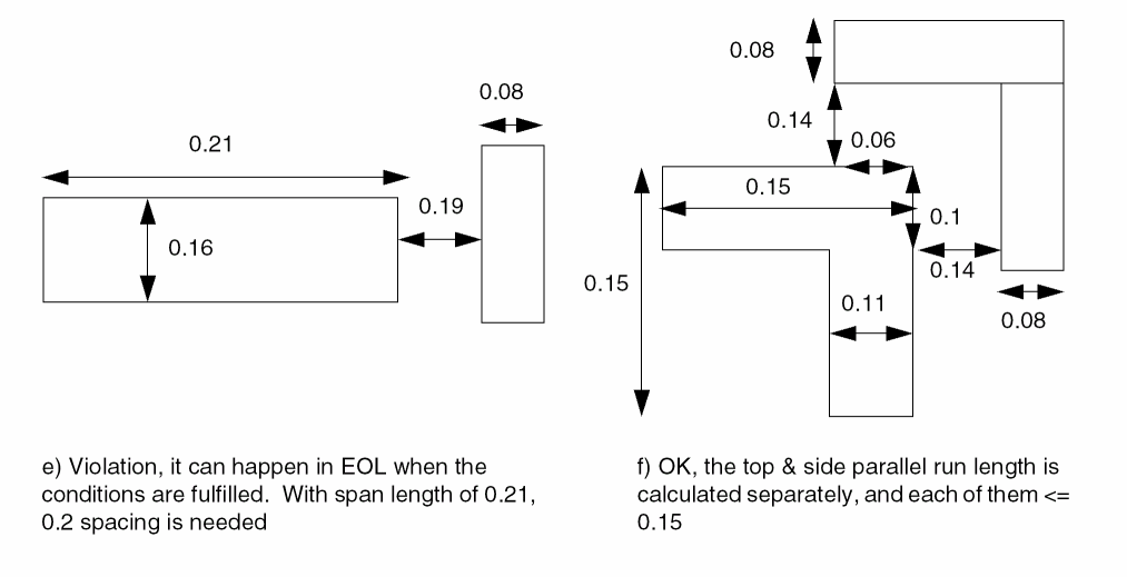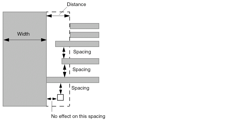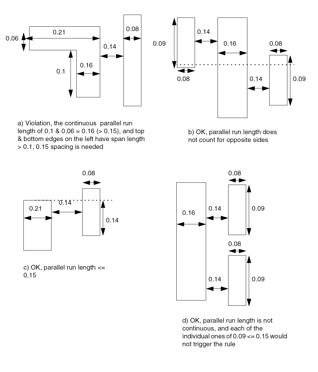 The parallel run length is measured as a sum of lengths between objects. Turning corners may break up the parallel run length thus resulting in inaccurate calculations. These are supplement spacing constraints, in addition to the regular spacing based on wire width. |