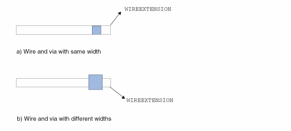 In theDEF, a vertical default route in theNETSsection will have a width of 0.10 μm with extension of 0.05 μm, while a horizontal route will have a width of 0.14 μm with extension of 0.05 μm.