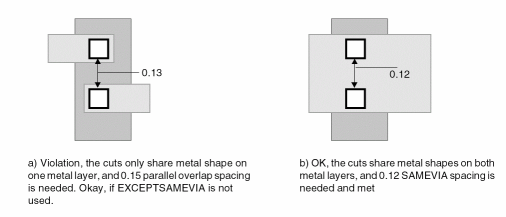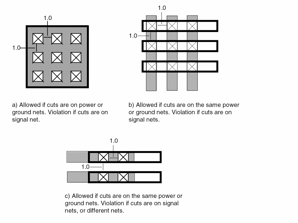 Voltage spacing rules can be used to define spacing among vias objects on the same cut layer in different voltages.