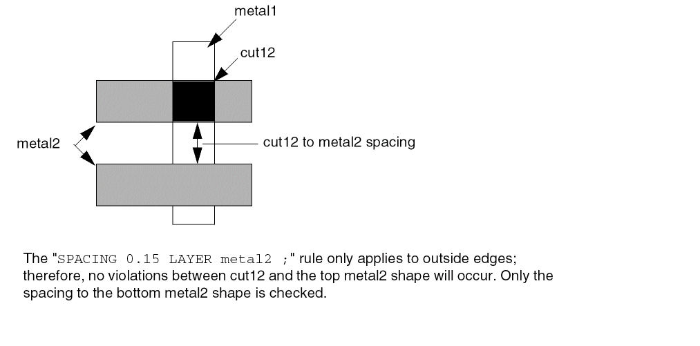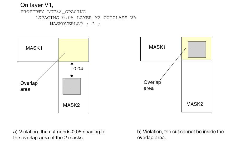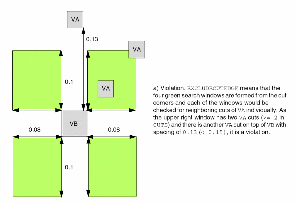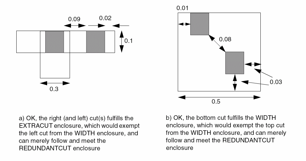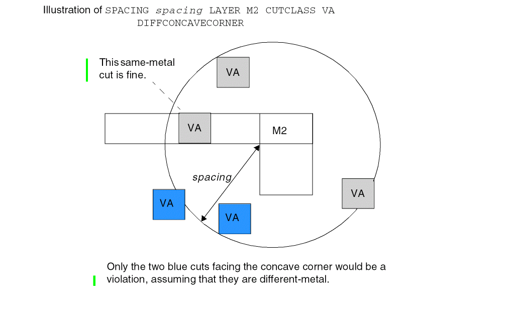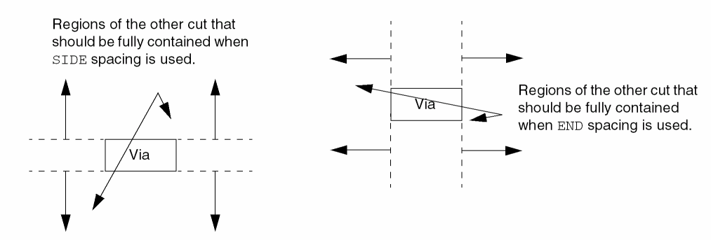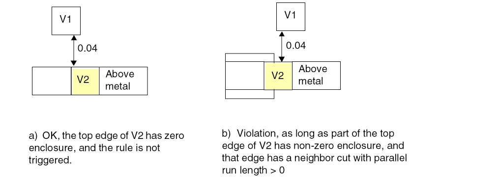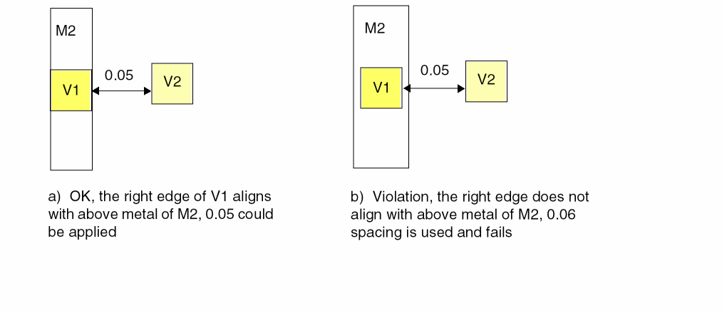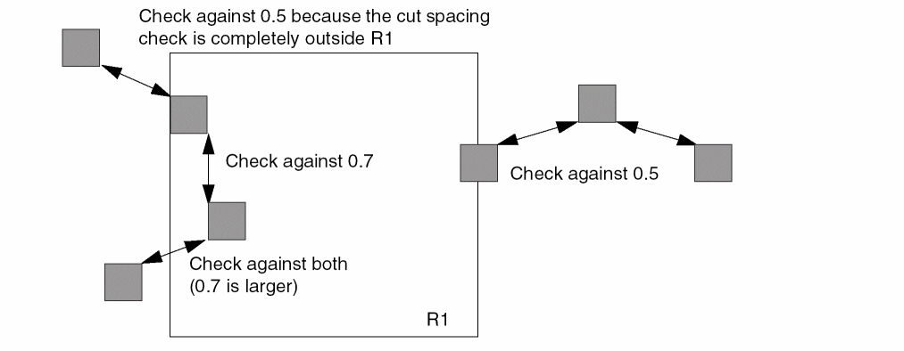 The following example means that a cut overlapping region R1 should have spacing of 0.7 and a cut spacing check outside region R1 should have spacing of 0.5. Adjacent cut and any other rules on layer V1 (without REGION) would also be applied on region R1: