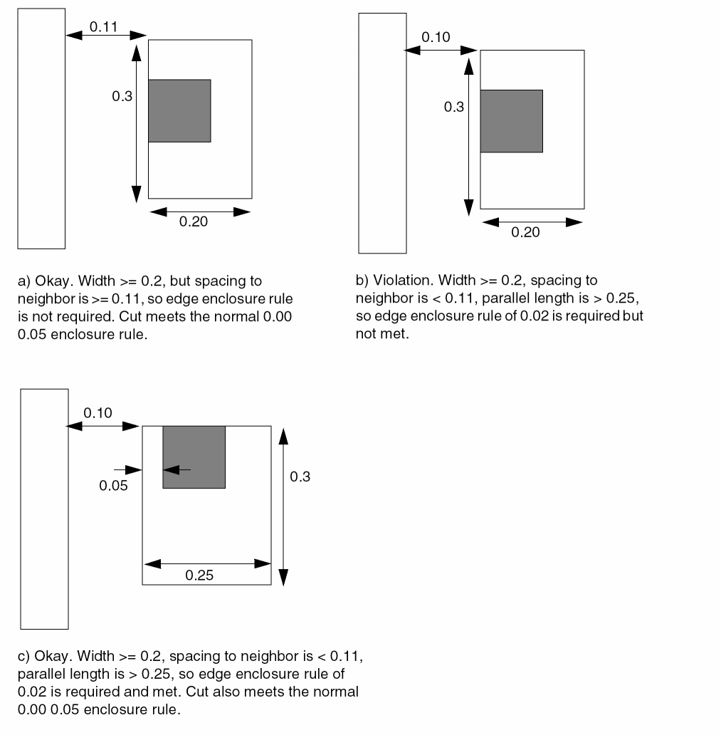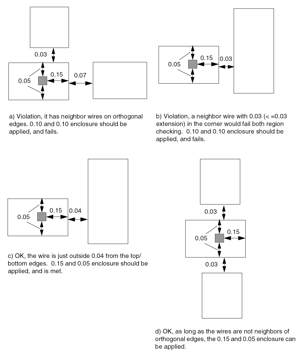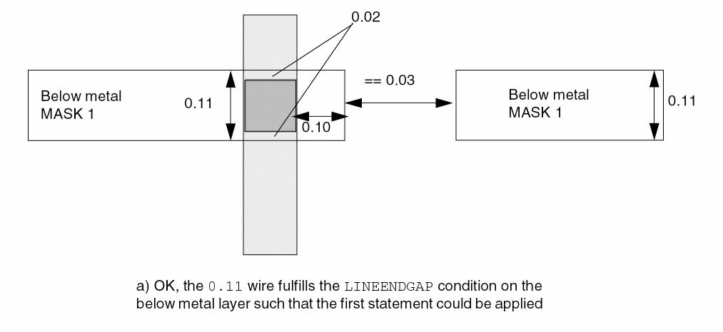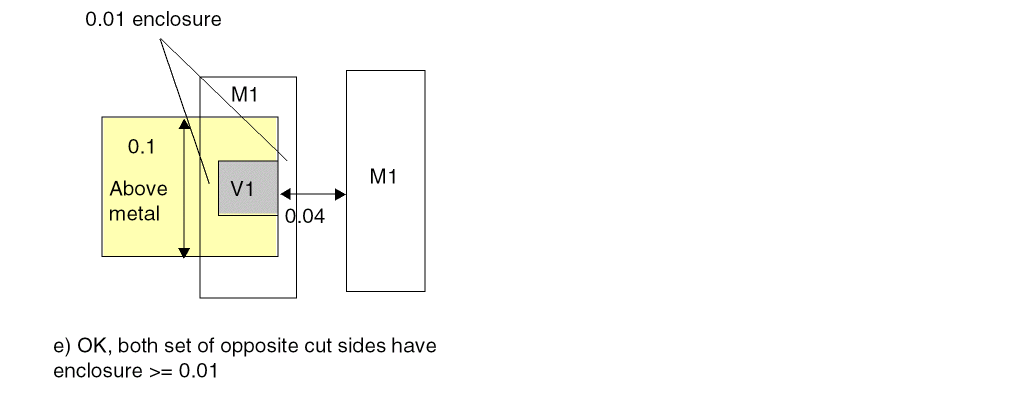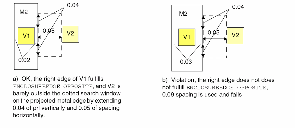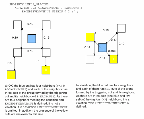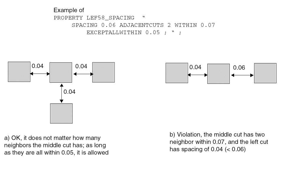 The following example means that a cut overlapping region R1 should have spacing of 0.7 and a cut spacing check outside region R1 should have spacing of 0.5. Adjacent cut and any other rules on layer V1 (without REGION) would also be applied on region R1: