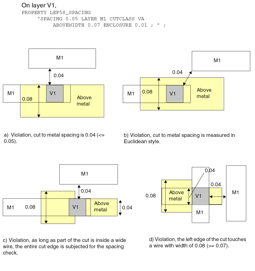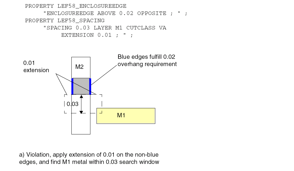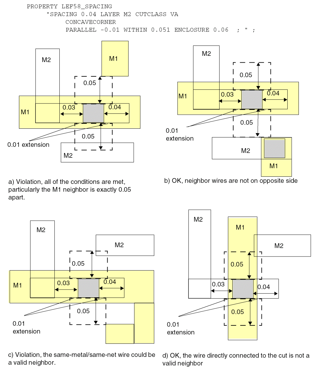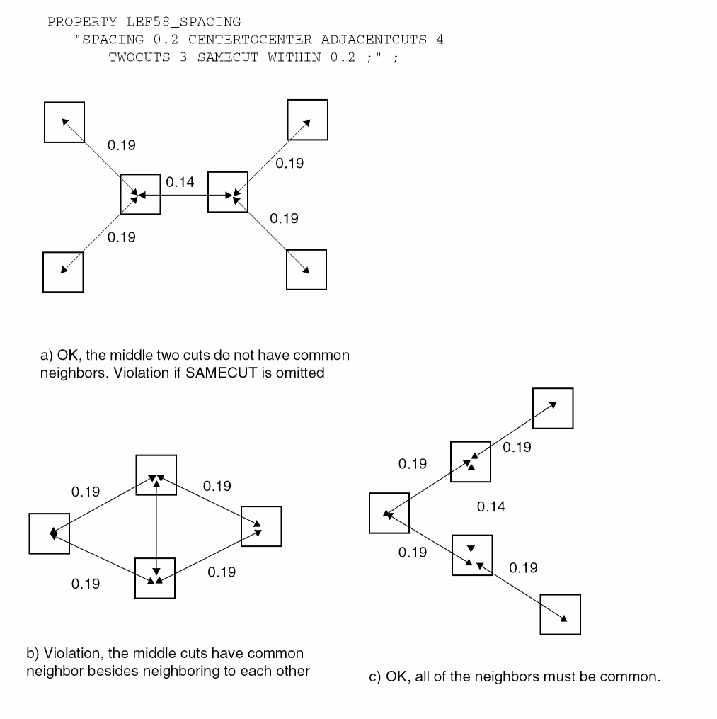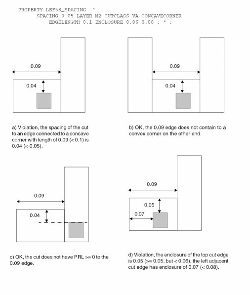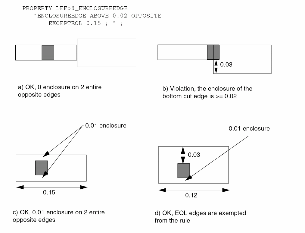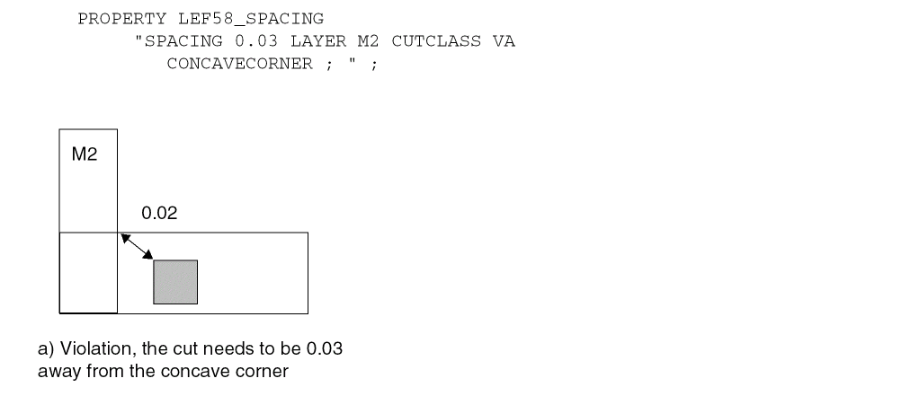 LAYERlayerNameTYPE CUT ; [MASKmaskNum;] [SPACINGcutSpacing[CENTERTOCENTER] [SAMENET] [ LAYERsecondLayerName[STACK] | ADJACENTCUTS {2 | 3 | 4} WITHINcutWithin[EXCEPTSAMEPGNET] | PARALLELOVERLAP | AREAcutArea] ;] ... [SPACINGTABLE ORTHOGONAL {WITHINcutWithinSPACINGorthoSpacing} ... ;] [ARRAYSPACING [LONGARRAY] [WIDTHviaWidth] CUTSPACINGcutSpacing{ARRAYCUTSarrayCutsSPACINGarraySpacing} ... ;] [WIDTHminWidth;] [ENCLOSURE [ABOVE | BELOW]overhang1overhang2[ WIDTHminWidth[EXCEPTEXTRACUTcutWithin] | LENGTHminLength] ;] ... [PREFERENCLOSURE [ABOVE | BELOW]overhang1overhang2[WIDTHminWidth] ;] ... [RESISTANCEresistancePerCut;] [PROPERTYpropName propVal;] ... [ACCURRENTDENSITY {PEAK | AVERAGE | RMS} {value| FREQUENCY freq_1 freq_2 ... ; [CUTAREA cutArea_1cutArea_2... ;] TABLEENTRIESv_freq_1_cutArea_1 v_freq_1_cutArea_2 ... v_freq_2_cutArea_1 v_freq_2_cutArea_2 ... ...} ;][DCCURRENTDENSITY AVERAGE {value| CUTAREAcutArea_1cutArea_2 ...; TABLEENTRIESvalue_1 value_2 ...} ;] [ANTENNAMODEL {OXIDE1 | OXIDE2 | OXIDE3 | OXIDE4 | OXIDE5 | ... | OXIDE32} ;] ... [ANTENNAAREARATIOvalue;] ... [ANTENNADIFFAREARATIO {value| PWL ( (d1r1) (d2r2) ...)} ;] ... [ANTENNACUMAREARATIOvalue;] ... [ANTENNACUMDIFFAREARATIO {value| PWL ( (d1r1) (d2r2) ...)} ;] ... [ANTENNAAREAFACTORvalue[DIFFUSEONLY] ;] ... [ANTENNACUMROUTINGPLUSCUT ;] [ANTENNAGATEPLUSDIFFplusDiffFactor;] [ANTENNAAREAMINUSDIFFminusDiffFactor;] [ANTENNAAREADIFFREDUCEPWL ( (diffArea1diffAreaFactor1) (diffArea2diffAreaFactor2) ...) ; ] [PROPERTY LEF58_TYPE “TYPE [TSV [LAYERbottomLayer topLayer]| PASSIVATION | MIMCAP | HIGHR | SPECIALCUT LAYERbottomLayer topLayer] ;” ;] [PROPERTY LEF58_ADJACENTFOURCUTS "ADJACENTFOURCUTScutSpacingCUTCLASS {className[TO ALL] | ALL} {ABOVE | BELOW} PARALLELparLengthWITHINparWithin[MERGEDCUTS] [HORIZONTAL|VERTICAL] [EXCEPTDIFFMETAL [NOEXTRACUT]] [MINCORNER | MININNERCORNER | MAXINNERCORNER] [EXCEPTMAXPRLmaxPrl] [EXCEPTMINLENGTHminLength] [WITHINCUTwithin] [EXCEPTOTHERWIDTHWITHCUTwidth] [METALWIDTHmaxWidth] ; " ;] [PROPERTY LEF58_ANTENNADIFFGATEPWL "ANTENNADIFFGATEPWL {OXIDE1 | OXIDE2 | OXIDE3 | OXIDE4 | OXIDE5 | ... | OXIDE32} ((gateArea1effectiveGateArea1) (gateArea2effectiveGateArea2) ... ) ;" ;] [PROPERTY LEF58_ANTENNADIFFONLYAREARATIO “ANTENNADIFFONLYAREARATIO {OXIDE1 | OXIDE2 | OXIDE3 | OXIDE4 | OXIDE5 | ... | OXIDE32}value;..." ;] [PROPERTY LEF58_ANTENNADIFFPROTECTORAREARATIO “ANTENNADIFFPROTECTORAREARATIO {OXIDE1 | OXIDE2 | OXIDE3 | OXIDE4 | OXIDE5 | ...| OXIDE32}value;..." ;] [PROPERTY LEF58_ANTENNAGATEPWL "ANTENNAGATEPWL {OXIDE1 | OXIDE2 | OXIDE3 | OXIDE4 | OXIDE5 | ... | OXIDE32} ((gateArea1effectiveGateArea1) (gateArea2effectiveGateArea2) ... ) ;" ;] [PROPERTY LEF58_ANTENNAGATEPLUSDIFF "ANTENNAGATEPLUSDIFF {OXIDE1 | OXIDE2 | OXIDE3 | OXIDE4 | OXIDE5 | ... | OXIDE32} {plusDiffFactor|PWL((diffArea1plusDiffProtect1) (diffArea1plusDiffProtect2) ...)} ;" ;] [PROPERTY LEF58_ARRAYSPACING "ARRAYSPACING [CUTCLASSclassName] [PARALLELOVERLAP] [LONGARRAY] [WIDTHviaWidth] [WITHIN within ARRAYWIDTH arrayWidth] CUTSPACINGcutSpacing{ARRAYCUTSarrayCutsSPACINGarraySpacing} ... ;..." ;] [PROPERTY LEF58_BACKSIDE “BACKSIDE ;” ;] [PROPERTY LEF58_CUTCLASS "CUTCLASSclassNameWIDTHviaWidth[LENGTHviaLength] [CUTSnumCut] [ORIENT {HORIZONTAL | VERTICAL}] ; " ;] [PROPERTY LEF58_CUTONCENTERLINE "CUTONCENTERLINEwidthCUTCLASSclassName[ABOVE | BELOW] [EXTRACUTcutWithinWIDTHexactWidth] ; " ;] [PROPERTY LEF58_DIRECTIONALSPACING "DIRECTIONALSPACINGcutSpacing{HORIZONTAL | VERTICAL} PRLprlCUTCLASSclassName1TOclassName2[PARALLELparLengthWITHINparWithin[EXCLUDECUTEDGE] [CUTSnumCuts] [VIAGROUPgroupName]] ; " ;] [PROPERTY LEF58_ENCLOSURE "ENCLOSURE [CUTCLASSclassName][ABOVE | BELOW] [MINCORNER] {EOLeolWidth[HORIZONTAL | VERTICAL] [MINLENGTHminLength] [EOLONLY] [SHORTEDGEONEOL]eolOverhangotherOverhang[SIDESPACINGspacingEXTENSIONbackwardExtforwardExt|ENDSPACINGspacingEXTENSIONextension] |{overhang1overhang2|[OFFCENTERLINE] ENDoverhang1SIDEoverhang2|HORIZONTALoverhang1VERTICALoverhang2} [JOGLENGTHONLYlength[INCLUDELSHAPE] ] [HOLLOW {HORIZONTAL|VERTICAL}length] [ WIDTHminWidth[INCLUDEABUTTED] [EXCEPTEXTRACUTcutWithin[PRL | NOSHAREDEDGE | EXACTPRLprl]] | LENGTHminLength| EXTRACUT [EXTRAONLY [PRLprl]] | REDUNDANTCUTcutWithin| PARALLELparLength[parLength2] WITHINparWithin[parWithin2] [BELOWENCLOSUREbelowEnclosure[ALLSIDESenclosure1enclosure2] |ABOVEENCLOSUREaboveEnclosure] | CONCAVECORNERSnumCorner| OTHERWITHINWIDTHwidthWITHINwithin[ OTHERSIDEotherEnclosure]] } ;..." ;] [PROPERTY LEF58_ENCLOSUREEDGE "ENCLOSUREEDGE [CUTCLASSclassName][ABOVE | BELOW]overhang{OPPOSITE {[EXCEPTEOLeolWidth] [NOCONCAVECORNERwithin] [CUTTOBELOWSPACINGspacing[ABOVEMETALextension]] | WRONGDIRECTION } |[INCLUDECORNER] {WIDTH [BOTHWIRE]minWidth[maxWidth]|SPANLENGTHminSpanLength[maxSpanLength]} PARALLELparLength{WITHINparWithin| WITHINminWithinmaxWithin} [EXCEPTEXTRACUT [cutWithin]] [EXCEPTTWOEDGES [exceptWithin]] |CONVEXCORNERSconvexLengthadjacentLengthPARALLELparWithinLENGTHlength} ;..." ;] [PROPERTY LEF58_ENCLOSURETABLE "ENCLOSURETABLE [CUTCLASSclassName] [MASKmaskNum] [OTHERMASKotherMaskNum] [USEMAXWIDTH | USEMINWIDTH | WITHINFIRSTWIDTH] [DEFAULT {[ABOVE| BELOW]overhang1overhang2overhang3overhang4}...] {WIDTHwidth{[ABOVE| BELOW]overhang1overhang2overhang3overhang4[MINSUM] [MUSTUSE] [MAXLENGTHlength| LENGTHlength] [LAYERtrimLayerOVERLAP {1|2} [TRIMLENGTHOUTERMETALtrimLength] | OTHERWITHINWIDTHwidth[LAYERlayerName] WITHINwithin[OTHERSIDEotherEnclosure]] | LINEENDGAPONLY | ROWBOUNDARYwithinOTHERSIDEotherEnclosure] [EXACTZERO] [INCLUDEABUTTED]}... | OTHERWIDTHotherWidth[PARALLEL parLength WITHIN parWithin] {{ABOVE| BELOW}overhang1overhang2overhang3overhang4[MINSUM]}...}... ; " ;] [PROPERTY LEF58_ENCLOSURETOJOINT "ENCLOSURETOJOINT [CUTCLASSclassName] [ABOVE | BELOW]toOneJointOverhang[toBothJointOverhang] [EOLMINLENGTHminLength] JOINTWIDTHjointWidthJOINTLENGTHspanLength; " ;] [PROPERTY LEF58_ENCLOSUREWIDTH "ENCLOSUREWIDTH {VIAOVERLAPONLY | USEMINWIDTH} ;..." ;] [PROPERTY LEF58_EOLENCLOSURE "