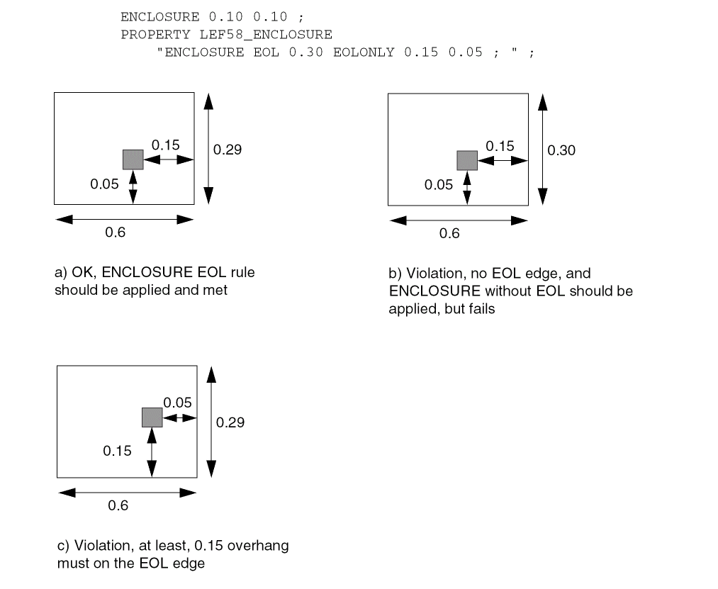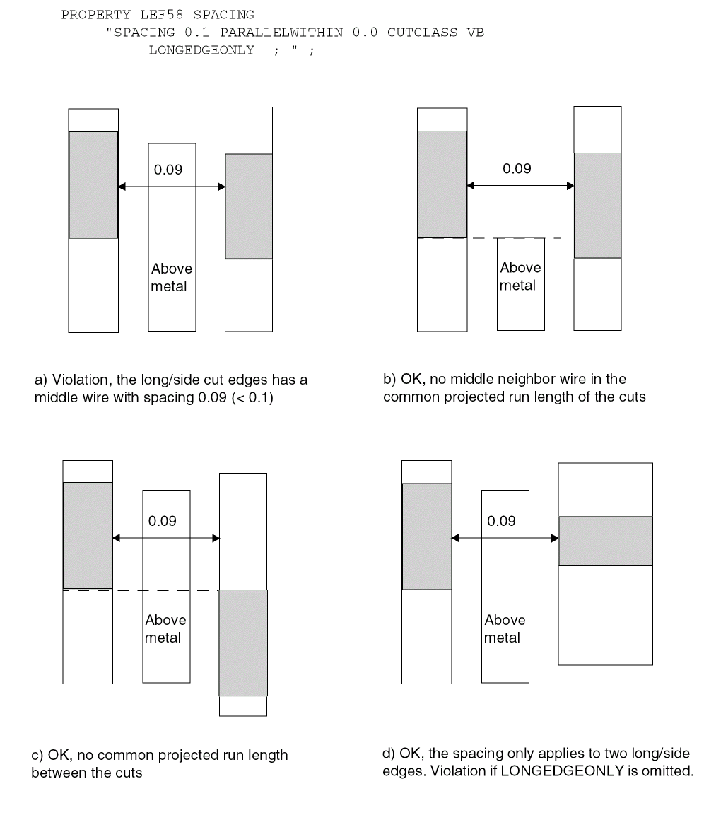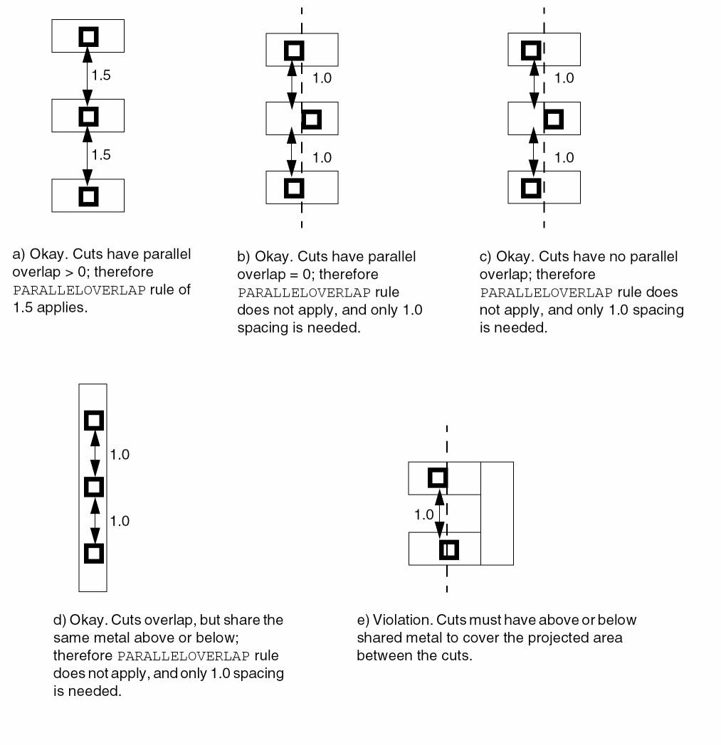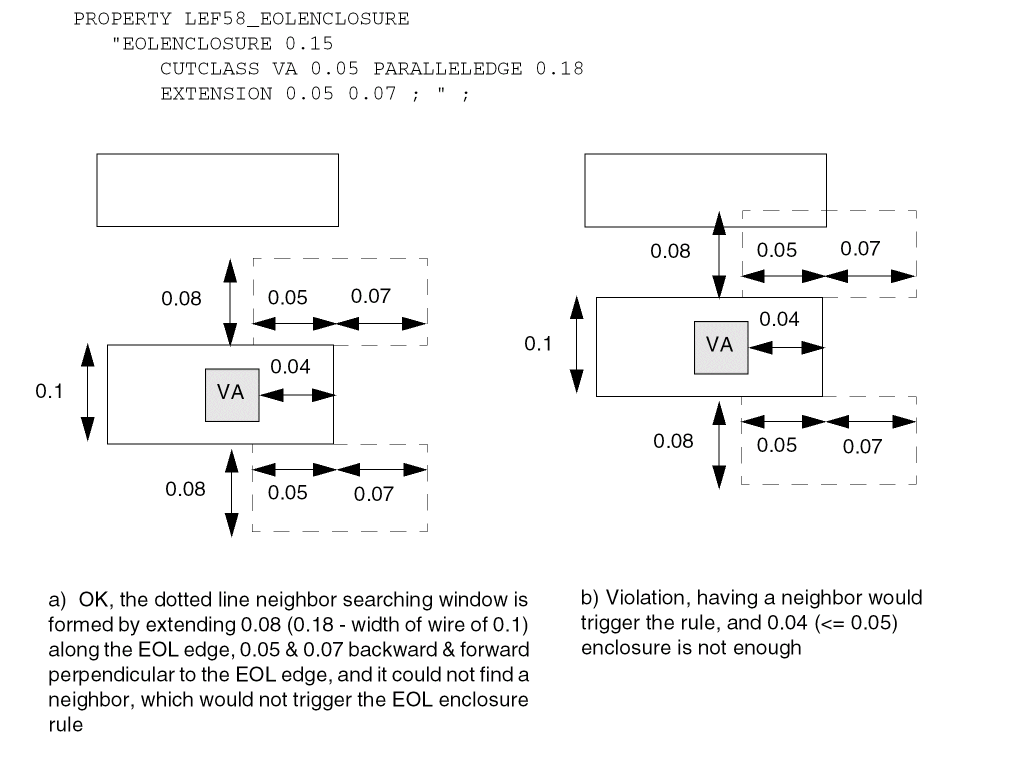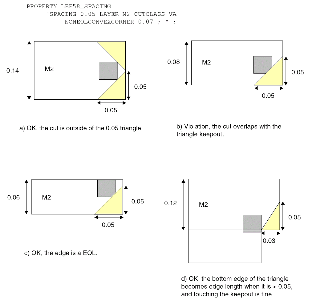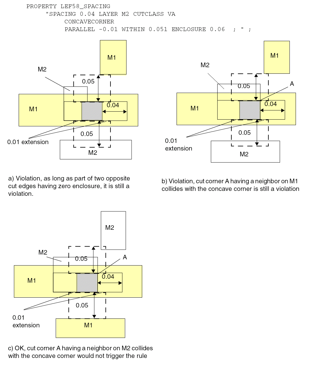 LAYERlayerNameTYPE CUT ; [MASKmaskNum;] [SPACINGcutSpacing[CENTERTOCENTER] [SAMENET] [ LAYERsecondLayerName[STACK] | ADJACENTCUTS {2 | 3 | 4} WITHINcutWithin[EXCEPTSAMEPGNET] | PARALLELOVERLAP | AREAcutArea] ;] ... [SPACINGTABLE ORTHOGONAL {WITHINcutWithinSPACINGorthoSpacing} ... ;] [ARRAYSPACING [LONGARRAY] [WIDTHviaWidth] CUTSPACINGcutSpacing{ARRAYCUTSarrayCutsSPACINGarraySpacing} ... ;] [WIDTHminWidth;] [ENCLOSURE [ABOVE | BELOW]overhang1overhang2[ WIDTHminWidth[EXCEPTEXTRACUTcutWithin] | LENGTHminLength] ;] ... [PREFERENCLOSURE [ABOVE | BELOW]overhang1overhang2[WIDTHminWidth] ;] ... [RESISTANCEresistancePerCut;] [PROPERTYpropName propVal;] ... [ACCURRENTDENSITY {PEAK | AVERAGE | RMS} {value| FREQUENCY freq_1 freq_2 ... ; [CUTAREA cutArea_1cutArea_2... ;] TABLEENTRIESv_freq_1_cutArea_1 v_freq_1_cutArea_2 ... v_freq_2_cutArea_1 v_freq_2_cutArea_2 ... ...} ;][DCCURRENTDENSITY AVERAGE {value| CUTAREAcutArea_1cutArea_2 ...; TABLEENTRIESvalue_1 value_2 ...} ;] [ANTENNAMODEL {OXIDE1 | OXIDE2 | OXIDE3 | OXIDE4 | OXIDE5 | ... | OXIDE32} ;] ... [ANTENNAAREARATIOvalue;] ... [ANTENNADIFFAREARATIO {value| PWL ( (d1r1) (d2r2) ...)} ;] ... [ANTENNACUMAREARATIOvalue;] ... [ANTENNACUMDIFFAREARATIO {value| PWL ( (d1r1) (d2r2) ...)} ;] ... [ANTENNAAREAFACTORvalue[DIFFUSEONLY] ;] ... [ANTENNACUMROUTINGPLUSCUT ;] [ANTENNAGATEPLUSDIFFplusDiffFactor;] [ANTENNAAREAMINUSDIFFminusDiffFactor;] [ANTENNAAREADIFFREDUCEPWL ( (diffArea1diffAreaFactor1) (diffArea2diffAreaFactor2) ...) ; ] [PROPERTY LEF58_TYPE “TYPE [TSV [LAYERbottomLayer topLayer]| PASSIVATION | MIMCAP | HIGHR | SPECIALCUT LAYERbottomLayer topLayer] ;” ;] [PROPERTY LEF58_ADJACENTFOURCUTS "ADJACENTFOURCUTScutSpacingCUTCLASS {className[TO ALL] | ALL} {ABOVE | BELOW} PARALLELparLengthWITHINparWithin[MERGEDCUTS] [HORIZONTAL|VERTICAL] [EXCEPTDIFFMETAL [NOEXTRACUT]] [MINCORNER | MININNERCORNER | MAXINNERCORNER] [EXCEPTMAXPRLmaxPrl] [EXCEPTMINLENGTHminLength] [WITHINCUTwithin] [EXCEPTOTHERWIDTHWITHCUTwidth] [METALWIDTHmaxWidth] ; " ;] [PROPERTY LEF58_ANTENNADIFFGATEPWL "ANTENNADIFFGATEPWL {OXIDE1 | OXIDE2 | OXIDE3 | OXIDE4 | OXIDE5 | ... | OXIDE32} ((gateArea1effectiveGateArea1) (gateArea2effectiveGateArea2) ... ) ;" ;] [PROPERTY LEF58_ANTENNADIFFONLYAREARATIO “ANTENNADIFFONLYAREARATIO {OXIDE1 | OXIDE2 | OXIDE3 | OXIDE4 | OXIDE5 | ... | OXIDE32}value;..." ;] [PROPERTY LEF58_ANTENNADIFFPROTECTORAREARATIO “ANTENNADIFFPROTECTORAREARATIO {OXIDE1 | OXIDE2 | OXIDE3 | OXIDE4 | OXIDE5 | ...| OXIDE32}value;..." ;] [PROPERTY LEF58_ANTENNAGATEPWL "ANTENNAGATEPWL {OXIDE1 | OXIDE2 | OXIDE3 | OXIDE4 | OXIDE5 | ... | OXIDE32} ((gateArea1effectiveGateArea1) (gateArea2effectiveGateArea2) ... ) ;" ;] [PROPERTY LEF58_ANTENNAGATEPLUSDIFF "ANTENNAGATEPLUSDIFF {OXIDE1 | OXIDE2 | OXIDE3 | OXIDE4 | OXIDE5 | ... | OXIDE32} {plusDiffFactor|PWL((diffArea1plusDiffProtect1) (diffArea1plusDiffProtect2) ...)} ;" ;] [PROPERTY LEF58_ARRAYSPACING "ARRAYSPACING [CUTCLASSclassName] [PARALLELOVERLAP] [LONGARRAY] [WIDTHviaWidth] [WITHIN within ARRAYWIDTH arrayWidth] CUTSPACINGcutSpacing{ARRAYCUTSarrayCutsSPACINGarraySpacing} ... ;..." ;] [PROPERTY LEF58_BACKSIDE “BACKSIDE ;” ;] [PROPERTY LEF58_CUTCLASS "CUTCLASSclassNameWIDTHviaWidth[LENGTHviaLength] [CUTSnumCut] [ORIENT {HORIZONTAL | VERTICAL}] ; " ;] [PROPERTY LEF58_CUTONCENTERLINE "CUTONCENTERLINEwidthCUTCLASSclassName[ABOVE | BELOW] [EXTRACUTcutWithinWIDTHexactWidth] ; " ;] [PROPERTY LEF58_DIRECTIONALSPACING "DIRECTIONALSPACINGcutSpacing{HORIZONTAL | VERTICAL} PRLprlCUTCLASSclassName1TOclassName2[PARALLELparLengthWITHINparWithin[EXCLUDECUTEDGE] [CUTSnumCuts] [VIAGROUPgroupName]] ; " ;] [PROPERTY LEF58_ENCLOSURE "ENCLOSURE [CUTCLASSclassName][ABOVE | BELOW] [MINCORNER] {EOLeolWidth[HORIZONTAL | VERTICAL] [MINLENGTHminLength] [EOLONLY] [SHORTEDGEONEOL]eolOverhangotherOverhang[SIDESPACINGspacingEXTENSIONbackwardExtforwardExt|ENDSPACINGspacingEXTENSIONextension] |{overhang1overhang2|[OFFCENTERLINE] ENDoverhang1SIDEoverhang2|HORIZONTALoverhang1VERTICALoverhang2} [JOGLENGTHONLYlength[INCLUDELSHAPE] ] [HOLLOW {HORIZONTAL|VERTICAL}length] [ WIDTHminWidth[INCLUDEABUTTED] [EXCEPTEXTRACUTcutWithin[PRL | NOSHAREDEDGE | EXACTPRLprl]] | LENGTHminLength| EXTRACUT [EXTRAONLY [PRLprl]] | REDUNDANTCUTcutWithin| PARALLELparLength[parLength2] WITHINparWithin[parWithin2] [BELOWENCLOSUREbelowEnclosure[ALLSIDESenclosure1enclosure2] |ABOVEENCLOSUREaboveEnclosure] | CONCAVECORNERSnumCorner| OTHERWITHINWIDTHwidthWITHINwithin[ OTHERSIDEotherEnclosure]] } ;..." ;] [PROPERTY LEF58_ENCLOSUREEDGE "ENCLOSUREEDGE [CUTCLASSclassName][ABOVE | BELOW]overhang{OPPOSITE {[EXCEPTEOLeolWidth] [NOCONCAVECORNERwithin] [CUTTOBELOWSPACINGspacing[ABOVEMETALextension]] | WRONGDIRECTION } |[INCLUDECORNER] {WIDTH [BOTHWIRE]minWidth[maxWidth]|SPANLENGTHminSpanLength[maxSpanLength]} PARALLELparLength{WITHINparWithin| WITHINminWithinmaxWithin} [EXCEPTEXTRACUT [cutWithin]] [EXCEPTTWOEDGES [exceptWithin]] |CONVEXCORNERSconvexLengthadjacentLengthPARALLELparWithinLENGTHlength} ;..." ;] [PROPERTY LEF58_ENCLOSURETABLE "ENCLOSURETABLE [CUTCLASSclassName] [MASKmaskNum] [OTHERMASKotherMaskNum] [USEMAXWIDTH | USEMINWIDTH | WITHINFIRSTWIDTH] [DEFAULT {[ABOVE| BELOW]overhang1overhang2overhang3overhang4}...] {WIDTHwidth{[ABOVE| BELOW]overhang1overhang2overhang3overhang4[MINSUM] [MUSTUSE] [MAXLENGTHlength| LENGTHlength] [LAYERtrimLayerOVERLAP {1|2} [TRIMLENGTHOUTERMETALtrimLength] | OTHERWITHINWIDTHwidth[LAYERlayerName] WITHINwithin[OTHERSIDEotherEnclosure]] | LINEENDGAPONLY | ROWBOUNDARYwithinOTHERSIDEotherEnclosure] [EXACTZERO] [INCLUDEABUTTED]}... | OTHERWIDTHotherWidth[PARALLEL parLength WITHIN parWithin] {{ABOVE| BELOW}overhang1overhang2overhang3overhang4[MINSUM]}...}... ; " ;] [PROPERTY LEF58_ENCLOSURETOJOINT "ENCLOSURETOJOINT [CUTCLASSclassName] [ABOVE | BELOW]toOneJointOverhang[toBothJointOverhang] [EOLMINLENGTHminLength] JOINTWIDTHjointWidthJOINTLENGTHspanLength; " ;] [PROPERTY LEF58_ENCLOSUREWIDTH "ENCLOSUREWIDTH {VIAOVERLAPONLY | USEMINWIDTH} ;..." ;] [PROPERTY LEF58_EOLENCLOSURE "