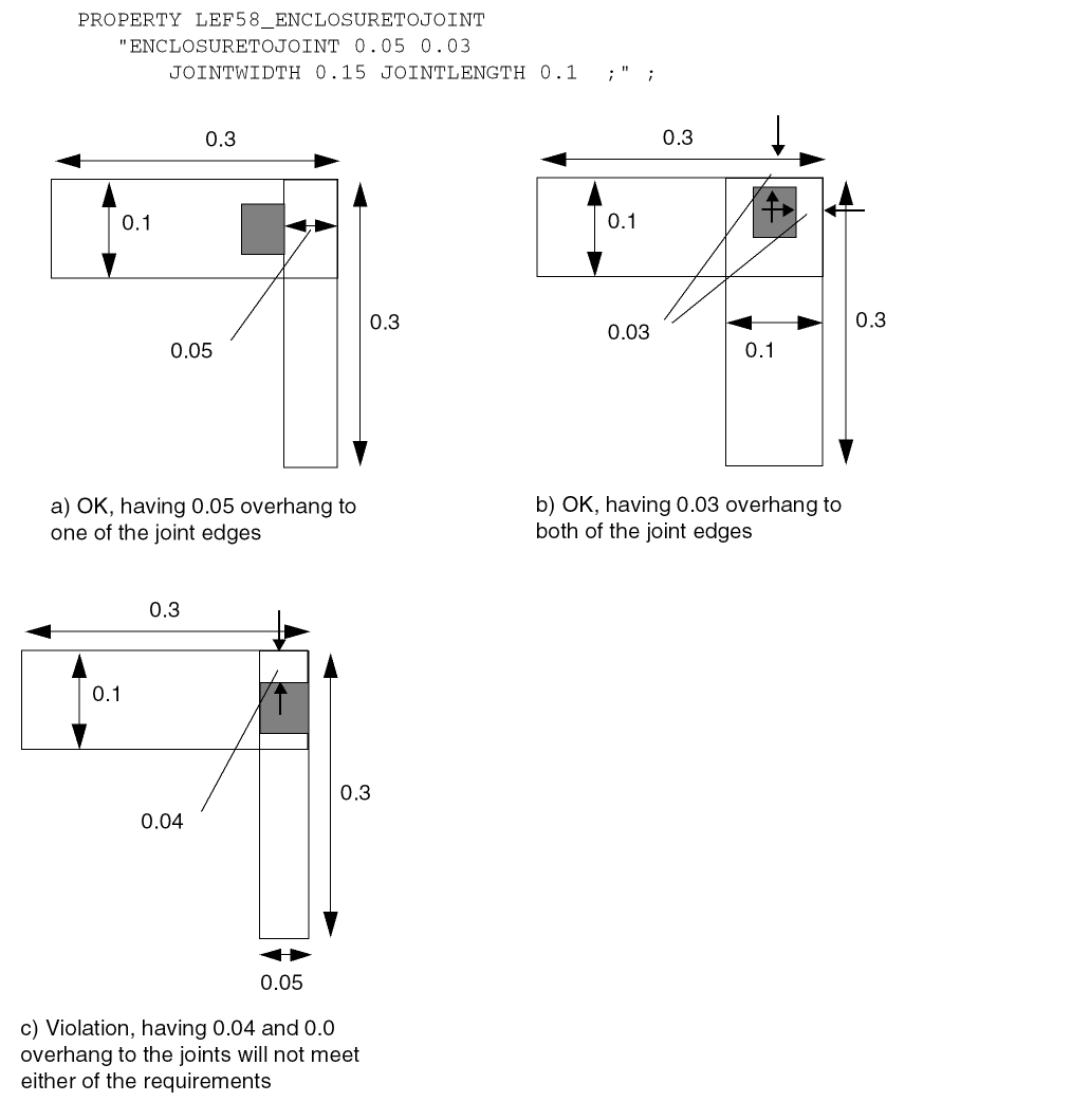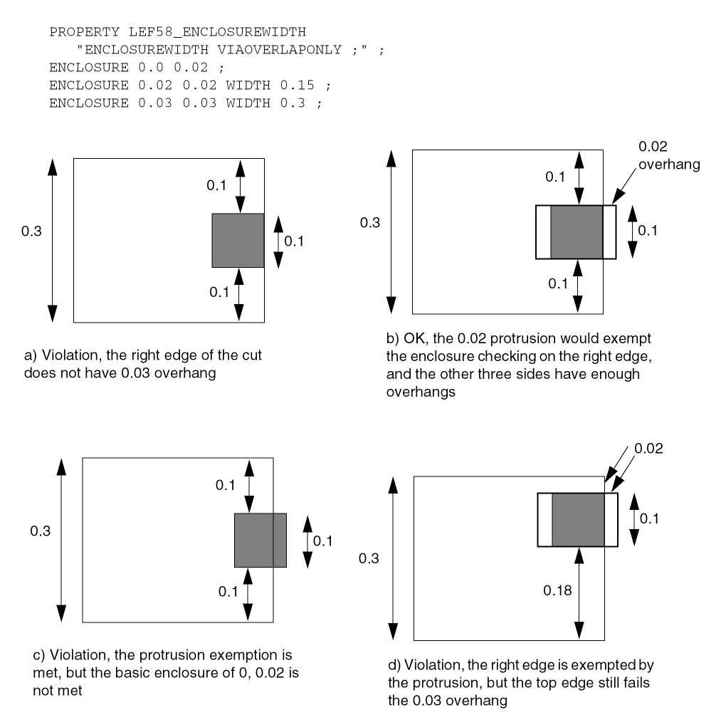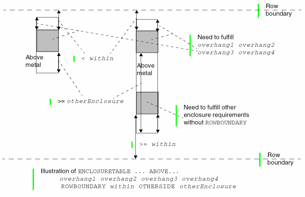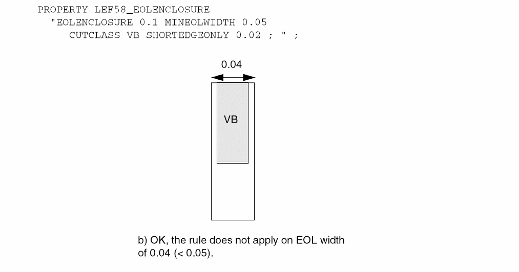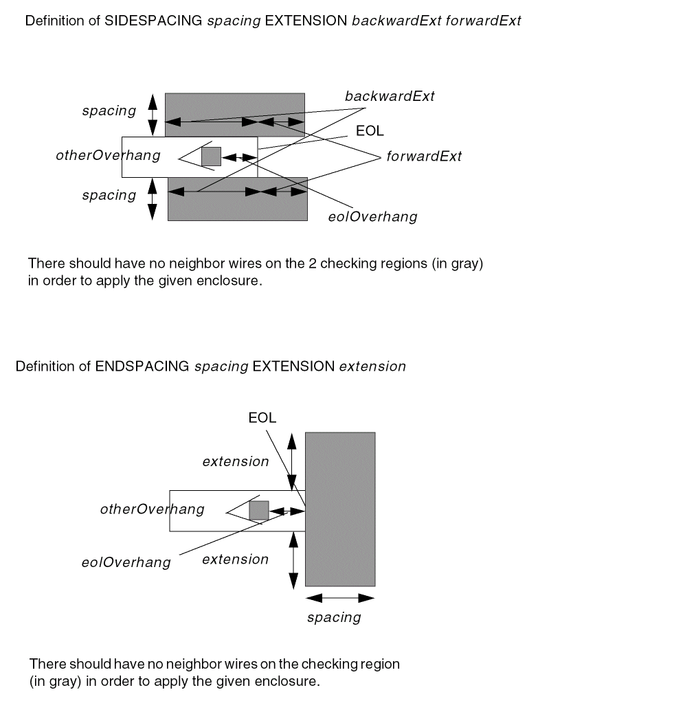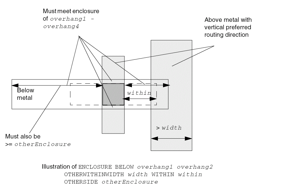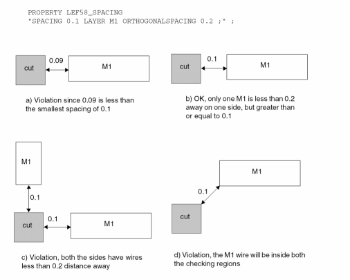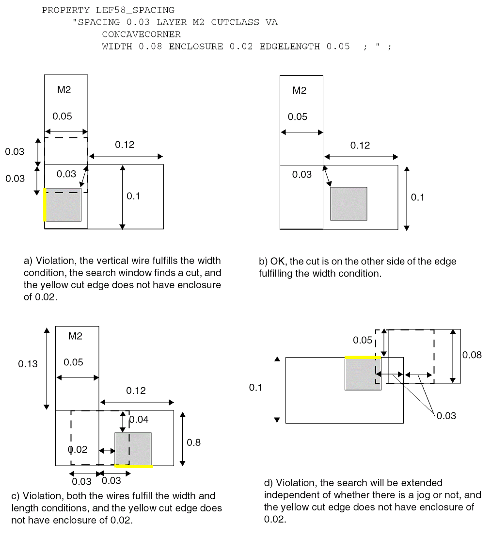 LAYERlayerNameTYPE CUT ; [MASKmaskNum;] [SPACINGcutSpacing[CENTERTOCENTER] [SAMENET] [ LAYERsecondLayerName[STACK] | ADJACENTCUTS {2 | 3 | 4} WITHINcutWithin[EXCEPTSAMEPGNET] | PARALLELOVERLAP | AREAcutArea] ;] ... [SPACINGTABLE ORTHOGONAL {WITHINcutWithinSPACINGorthoSpacing} ... ;] [ARRAYSPACING [LONGARRAY] [WIDTHviaWidth] CUTSPACINGcutSpacing{ARRAYCUTSarrayCutsSPACINGarraySpacing} ... ;] [WIDTHminWidth;] [ENCLOSURE [ABOVE | BELOW]overhang1overhang2[ WIDTHminWidth[EXCEPTEXTRACUTcutWithin] | LENGTHminLength] ;] ... [PREFERENCLOSURE [ABOVE | BELOW]overhang1overhang2[WIDTHminWidth] ;] ... [RESISTANCEresistancePerCut;] [PROPERTYpropName propVal;] ... [ACCURRENTDENSITY {PEAK | AVERAGE | RMS} {value| FREQUENCY freq_1 freq_2 ... ; [CUTAREA cutArea_1cutArea_2... ;] TABLEENTRIESv_freq_1_cutArea_1 v_freq_1_cutArea_2 ... v_freq_2_cutArea_1 v_freq_2_cutArea_2 ... ...} ;][DCCURRENTDENSITY AVERAGE {value| CUTAREAcutArea_1cutArea_2 ...; TABLEENTRIESvalue_1 value_2 ...} ;] [ANTENNAMODEL {OXIDE1 | OXIDE2 | OXIDE3 | OXIDE4 | OXIDE5 | ... | OXIDE32} ;] ... [ANTENNAAREARATIOvalue;] ... [ANTENNADIFFAREARATIO {value| PWL ( (d1r1) (d2r2) ...)} ;] ... [ANTENNACUMAREARATIOvalue;] ... [ANTENNACUMDIFFAREARATIO {value| PWL ( (d1r1) (d2r2) ...)} ;] ... [ANTENNAAREAFACTORvalue[DIFFUSEONLY] ;] ... [ANTENNACUMROUTINGPLUSCUT ;] [ANTENNAGATEPLUSDIFFplusDiffFactor;] [ANTENNAAREAMINUSDIFFminusDiffFactor;] [ANTENNAAREADIFFREDUCEPWL ( (diffArea1diffAreaFactor1) (diffArea2diffAreaFactor2) ...) ; ] [PROPERTY LEF58_TYPE “TYPE [TSV [LAYERbottomLayer topLayer]| PASSIVATION | MIMCAP | HIGHR | SPECIALCUT LAYERbottomLayer topLayer] ;” ;] [PROPERTY LEF58_ADJACENTFOURCUTS "ADJACENTFOURCUTScutSpacingCUTCLASS {className[TO ALL] | ALL} {ABOVE | BELOW} PARALLELparLengthWITHINparWithin[MERGEDCUTS] [HORIZONTAL|VERTICAL] [EXCEPTDIFFMETAL [NOEXTRACUT]] [MINCORNER | MININNERCORNER | MAXINNERCORNER] [EXCEPTMAXPRLmaxPrl] [EXCEPTMINLENGTHminLength] [WITHINCUTwithin] [EXCEPTOTHERWIDTHWITHCUTwidth] [METALWIDTHmaxWidth] ; " ;] [PROPERTY LEF58_ANTENNADIFFGATEPWL "ANTENNADIFFGATEPWL {OXIDE1 | OXIDE2 | OXIDE3 | OXIDE4 | OXIDE5 | ... | OXIDE32} ((gateArea1effectiveGateArea1) (gateArea2effectiveGateArea2) ... ) ;" ;] [PROPERTY LEF58_ANTENNADIFFONLYAREARATIO “ANTENNADIFFONLYAREARATIO {OXIDE1 | OXIDE2 | OXIDE3 | OXIDE4 | OXIDE5 | ... | OXIDE32}value;..." ;] [PROPERTY LEF58_ANTENNADIFFPROTECTORAREARATIO “ANTENNADIFFPROTECTORAREARATIO {OXIDE1 | OXIDE2 | OXIDE3 | OXIDE4 | OXIDE5 | ...| OXIDE32}value;..." ;] [PROPERTY LEF58_ANTENNAGATEPWL "ANTENNAGATEPWL {OXIDE1 | OXIDE2 | OXIDE3 | OXIDE4 | OXIDE5 | ... | OXIDE32} ((gateArea1effectiveGateArea1) (gateArea2effectiveGateArea2) ... ) ;" ;] [PROPERTY LEF58_ANTENNAGATEPLUSDIFF "ANTENNAGATEPLUSDIFF {OXIDE1 | OXIDE2 | OXIDE3 | OXIDE4 | OXIDE5 | ... | OXIDE32} {plusDiffFactor|PWL((diffArea1plusDiffProtect1) (diffArea1plusDiffProtect2) ...)} ;" ;] [PROPERTY LEF58_ARRAYSPACING "ARRAYSPACING [CUTCLASSclassName] [PARALLELOVERLAP] [LONGARRAY] [WIDTHviaWidth] [WITHIN within ARRAYWIDTH arrayWidth] CUTSPACINGcutSpacing{ARRAYCUTSarrayCutsSPACINGarraySpacing} ... ;..." ;] [PROPERTY LEF58_BACKSIDE “BACKSIDE ;” ;] [PROPERTY LEF58_CUTCLASS "CUTCLASSclassNameWIDTHviaWidth[LENGTHviaLength] [CUTSnumCut] [ORIENT {HORIZONTAL | VERTICAL}] ; " ;] [PROPERTY LEF58_CUTONCENTERLINE "CUTONCENTERLINEwidthCUTCLASSclassName[ABOVE | BELOW] [EXTRACUTcutWithinWIDTHexactWidth] ; " ;] [PROPERTY LEF58_DIRECTIONALSPACING "DIRECTIONALSPACINGcutSpacing{HORIZONTAL | VERTICAL} PRLprlCUTCLASSclassName1TOclassName2[PARALLELparLengthWITHINparWithin[EXCLUDECUTEDGE] [CUTSnumCuts] [VIAGROUPgroupName]] ; " ;] [PROPERTY LEF58_ENCLOSURE "ENCLOSURE [CUTCLASSclassName][ABOVE | BELOW] [MINCORNER] {EOLeolWidth[HORIZONTAL | VERTICAL] [MINLENGTHminLength] [EOLONLY] [SHORTEDGEONEOL]eolOverhangotherOverhang[SIDESPACINGspacingEXTENSIONbackwardExtforwardExt|ENDSPACINGspacingEXTENSIONextension] |{overhang1overhang2|[OFFCENTERLINE] ENDoverhang1SIDEoverhang2|HORIZONTALoverhang1VERTICALoverhang2} [JOGLENGTHONLYlength[INCLUDELSHAPE] ] [HOLLOW {HORIZONTAL|VERTICAL}length] [ WIDTHminWidth[INCLUDEABUTTED] [EXCEPTEXTRACUTcutWithin[PRL | NOSHAREDEDGE | EXACTPRLprl]] | LENGTHminLength| EXTRACUT [EXTRAONLY [PRLprl]] | REDUNDANTCUTcutWithin| PARALLELparLength[parLength2] WITHINparWithin[parWithin2] [BELOWENCLOSUREbelowEnclosure[ALLSIDESenclosure1enclosure2] |ABOVEENCLOSUREaboveEnclosure] | CONCAVECORNERSnumCorner| OTHERWITHINWIDTHwidthWITHINwithin[ OTHERSIDEotherEnclosure]] } ;..." ;] [PROPERTY LEF58_ENCLOSUREEDGE "ENCLOSUREEDGE [CUTCLASSclassName][ABOVE | BELOW]overhang{OPPOSITE {[EXCEPTEOLeolWidth] [NOCONCAVECORNERwithin] [CUTTOBELOWSPACINGspacing[ABOVEMETALextension]] | WRONGDIRECTION } |[INCLUDECORNER] {WIDTH [BOTHWIRE]minWidth[maxWidth]|SPANLENGTHminSpanLength[maxSpanLength]} PARALLELparLength{WITHINparWithin| WITHINminWithinmaxWithin} [EXCEPTEXTRACUT [cutWithin]] [EXCEPTTWOEDGES [exceptWithin]] |CONVEXCORNERSconvexLengthadjacentLengthPARALLELparWithinLENGTHlength} ;..." ;] [PROPERTY LEF58_ENCLOSURETABLE "ENCLOSURETABLE [CUTCLASSclassName] [MASKmaskNum] [OTHERMASKotherMaskNum] [USEMAXWIDTH | USEMINWIDTH | WITHINFIRSTWIDTH] [DEFAULT {[ABOVE| BELOW]overhang1overhang2overhang3overhang4}...] {WIDTHwidth{[ABOVE| BELOW]overhang1overhang2overhang3overhang4[MINSUM] [MUSTUSE] [MAXLENGTHlength| LENGTHlength] [LAYERtrimLayerOVERLAP {1|2} [TRIMLENGTHOUTERMETALtrimLength] | OTHERWITHINWIDTHwidth[LAYERlayerName] WITHINwithin[OTHERSIDEotherEnclosure]] | LINEENDGAPONLY | ROWBOUNDARYwithinOTHERSIDEotherEnclosure] [EXACTZERO] [INCLUDEABUTTED]}... | OTHERWIDTHotherWidth[PARALLEL parLength WITHIN parWithin] {{ABOVE| BELOW}overhang1overhang2overhang3overhang4[MINSUM]}...}... ; " ;] [PROPERTY LEF58_ENCLOSURETOJOINT "ENCLOSURETOJOINT [CUTCLASSclassName] [ABOVE | BELOW]toOneJointOverhang[toBothJointOverhang] [EOLMINLENGTHminLength] JOINTWIDTHjointWidthJOINTLENGTHspanLength; " ;] [PROPERTY LEF58_ENCLOSUREWIDTH "ENCLOSUREWIDTH {VIAOVERLAPONLY | USEMINWIDTH} ;..." ;] [PROPERTY LEF58_EOLENCLOSURE "