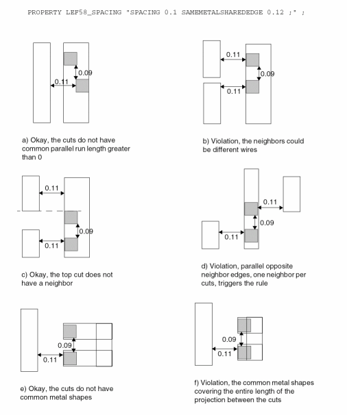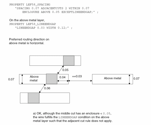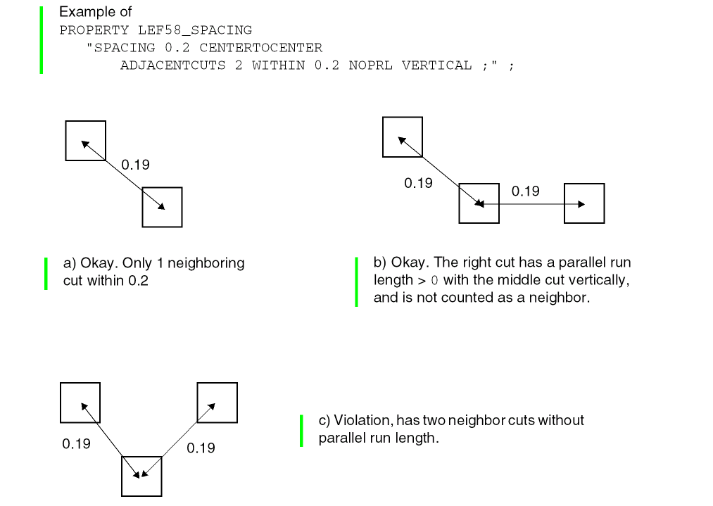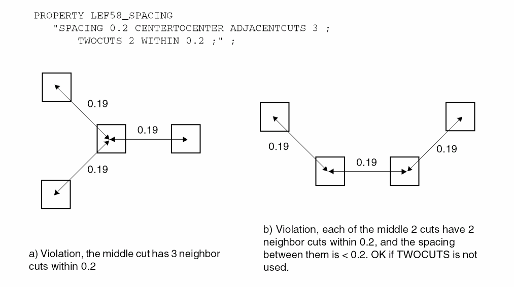 PROPERTY LEF58_SAMEMETALALIGNEDCUTS “SAMEMETALALIGNEDCUTS 2 CUTCLASS ALLBELOW WIDTH 0.04 SPACING 0.1 ; “ ;