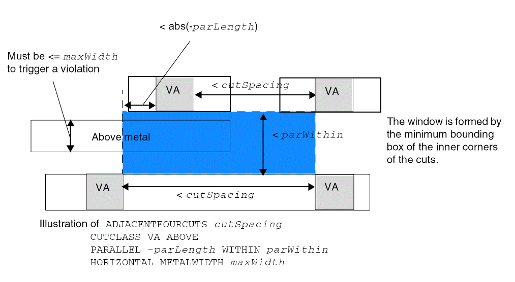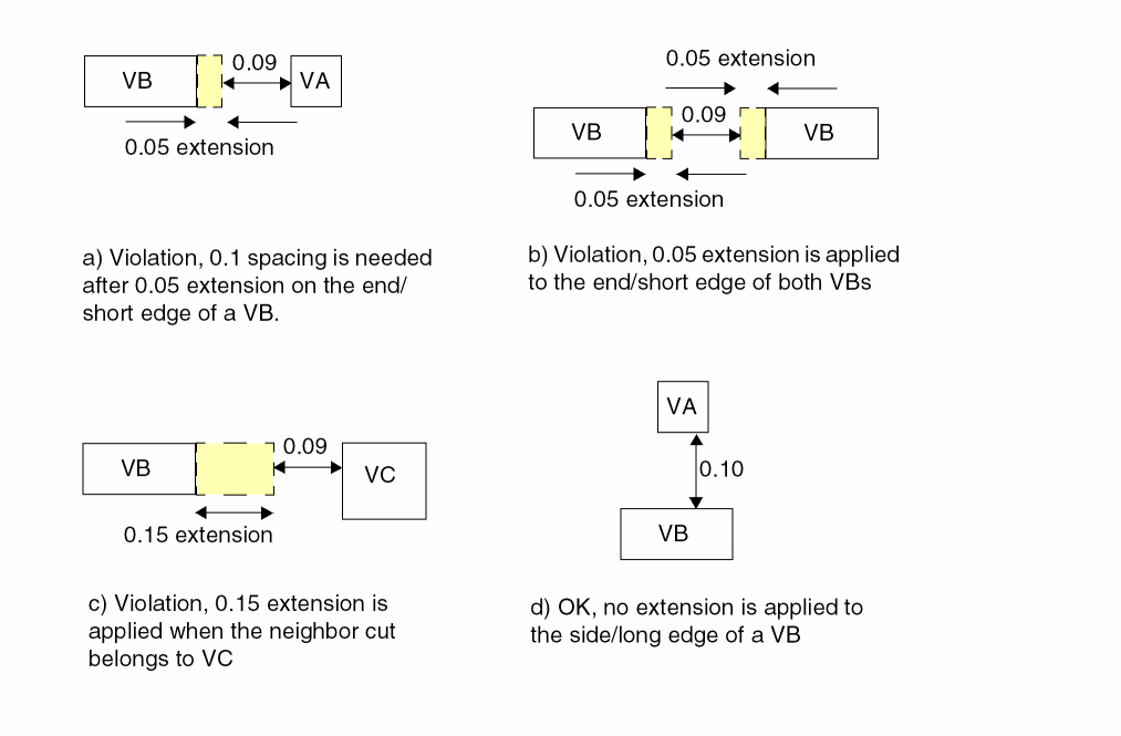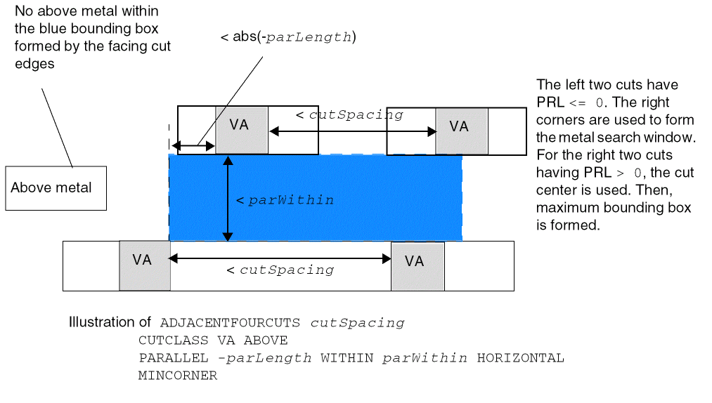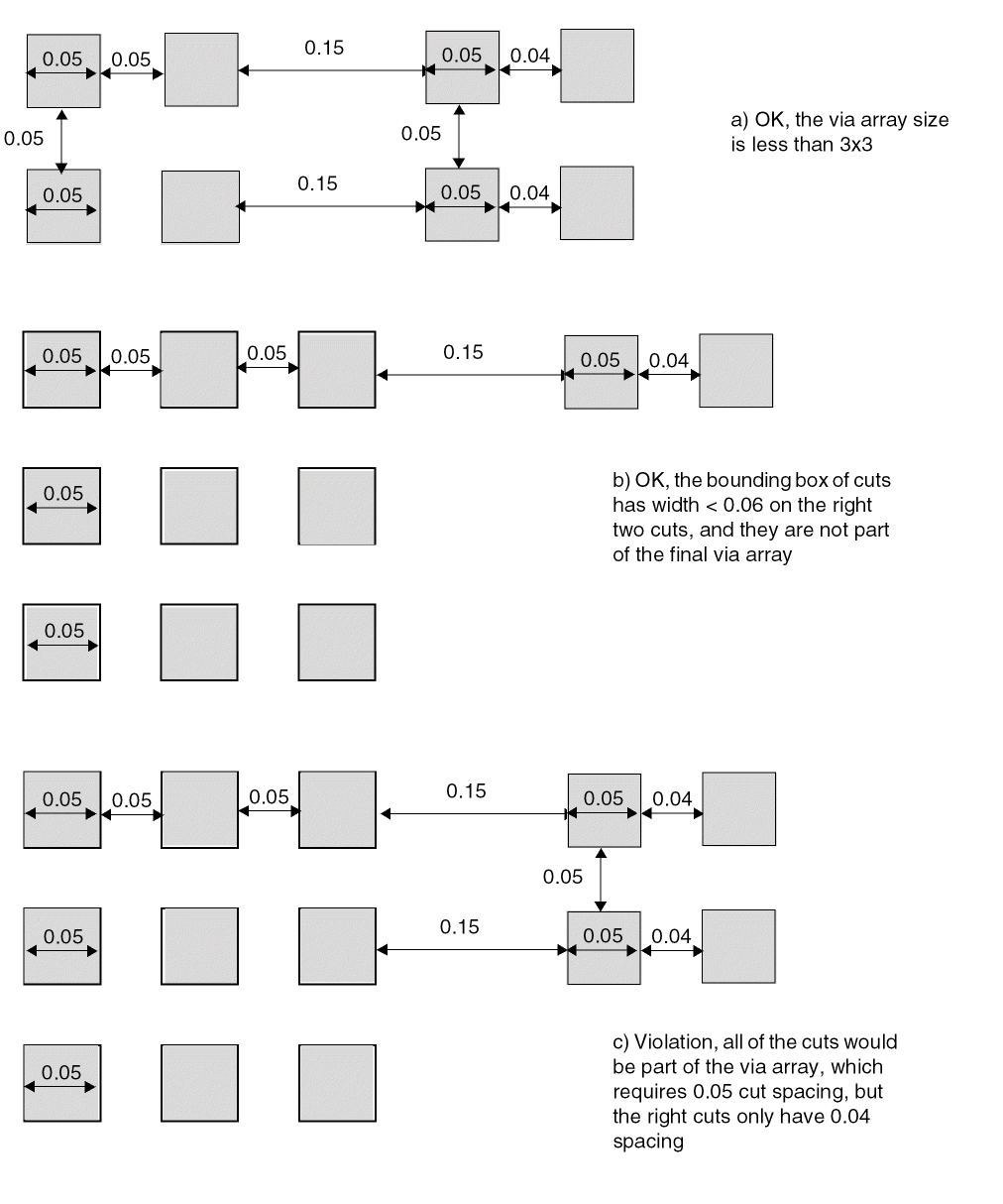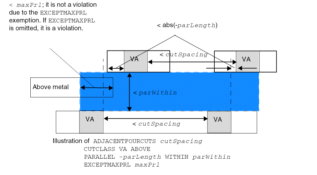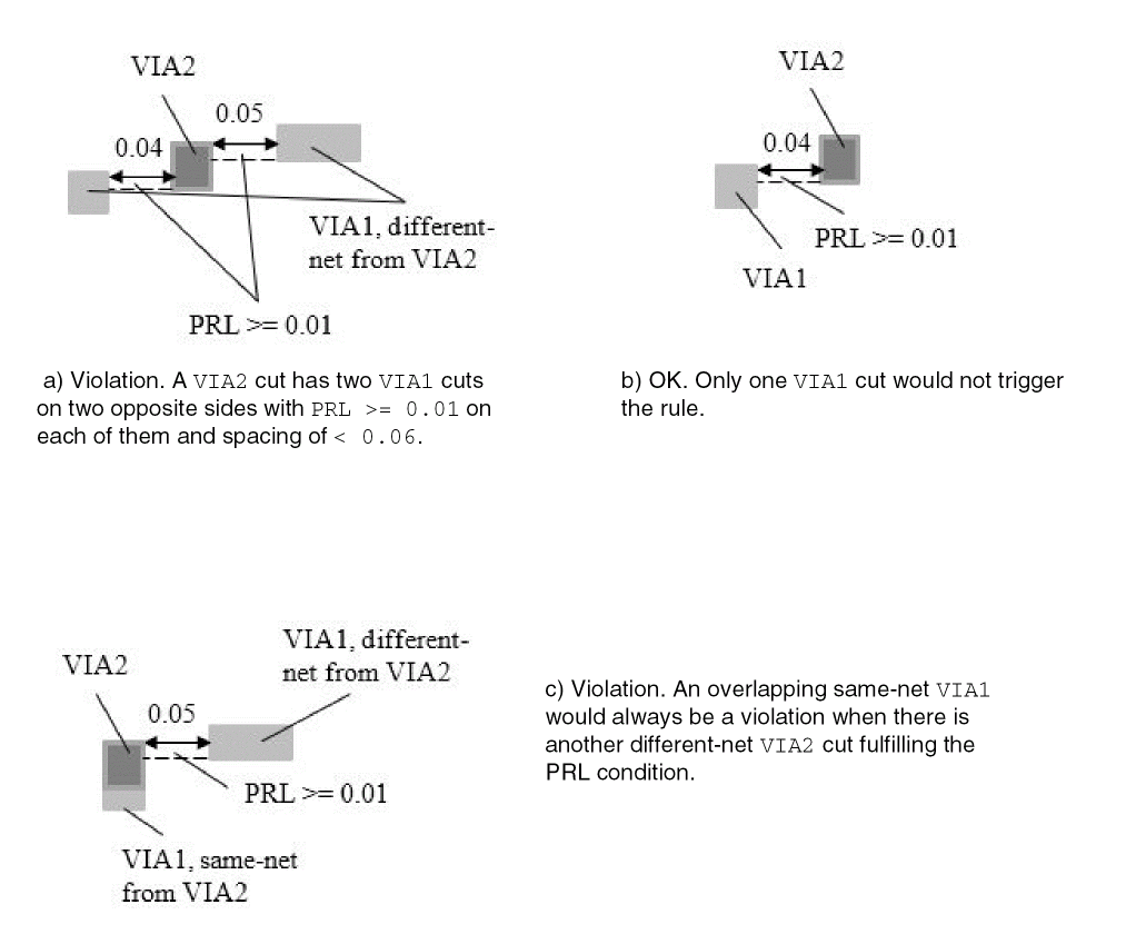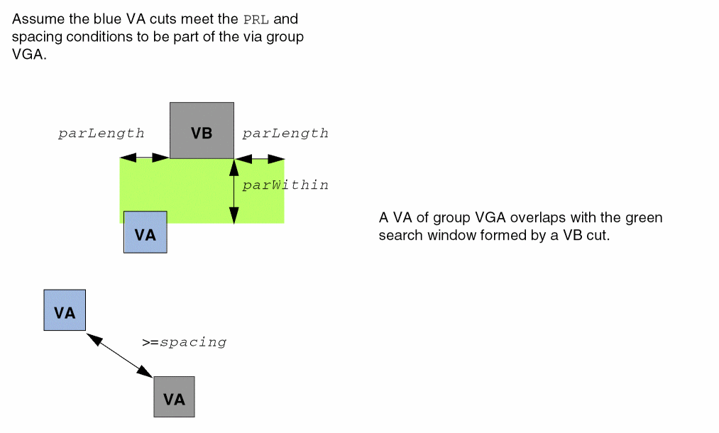 VIAGROUP VGA CUTS 3 CUTCLASS VAPRLTWOSIDESprl1 prl2 prl3 prl4SPACINGminSpacing maxSpacingVIAGROUPSPACINGspacingVIAGROUP VGA CUTS 2 CUTCLASS VAPARALLELparLengthWITHINparWithinOTHERCUTCLASS VB