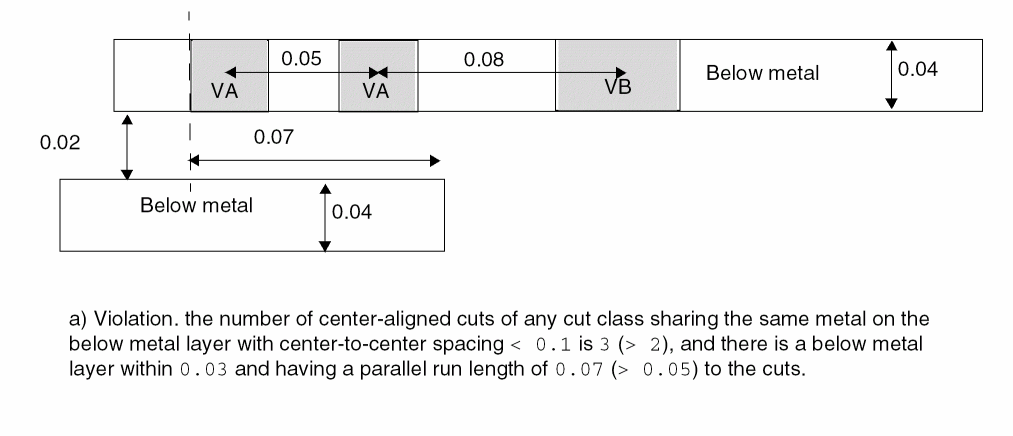 METALWITHINspecified:PROPERTY LEF58_SAMEMETALALIGNEDCUTS "SAMEMETALALIGNEDCUTS 2 CUTCLASS VABELOW WIDTH 0.04 SPACING 0.1 METALWITHIN 0.03; " ;