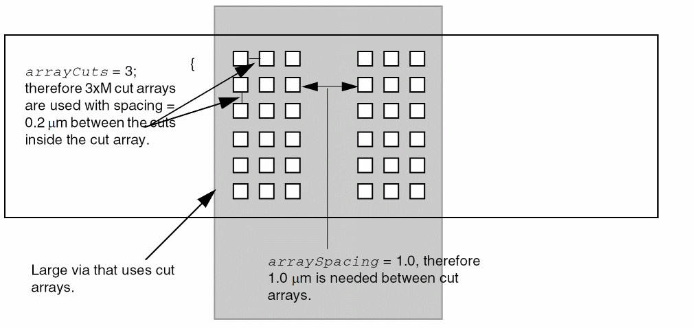 Specifies array spacing rules to use on the cut layer. An array spacing rule is intended for large vias of size 3x3 or larger.