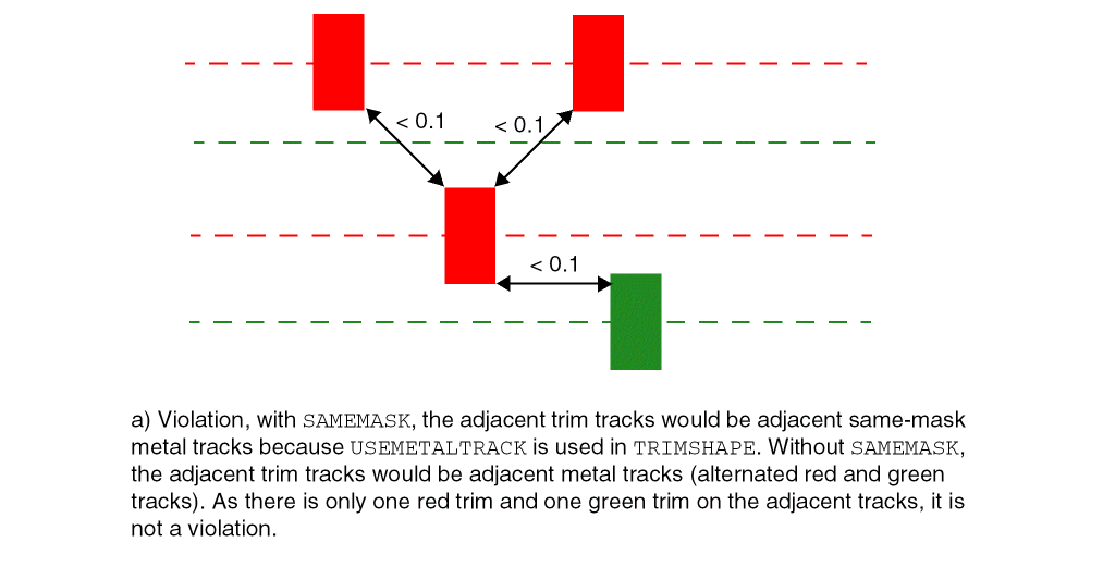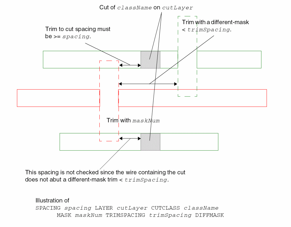 Specifies that the rule applies only on a trim with a neighbor trim within trimSpacing. Only cuts on a wire abutted to that neighbor trim would be checked against the rule. DIFFMASK means that the neighbor trim must have different mask from the triggering trim.