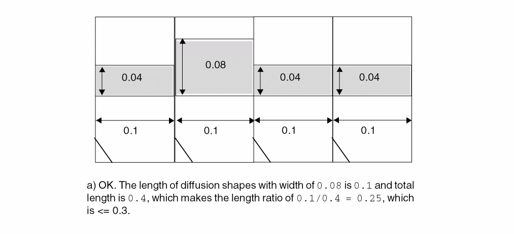 Specifies that the length ratio between the diffusion shapes with width exactly equal to width and all the diffusion shapes should be less than or equal to ratio, which is represented as a value between 0.0 and 100.0 in percentage. In other words, dividing the length of the diffusion shapes with width exactly equal to width by the length of all diffusion shapes should be less than or equal to ratio. Type: Float, between 0.0 and 100.0