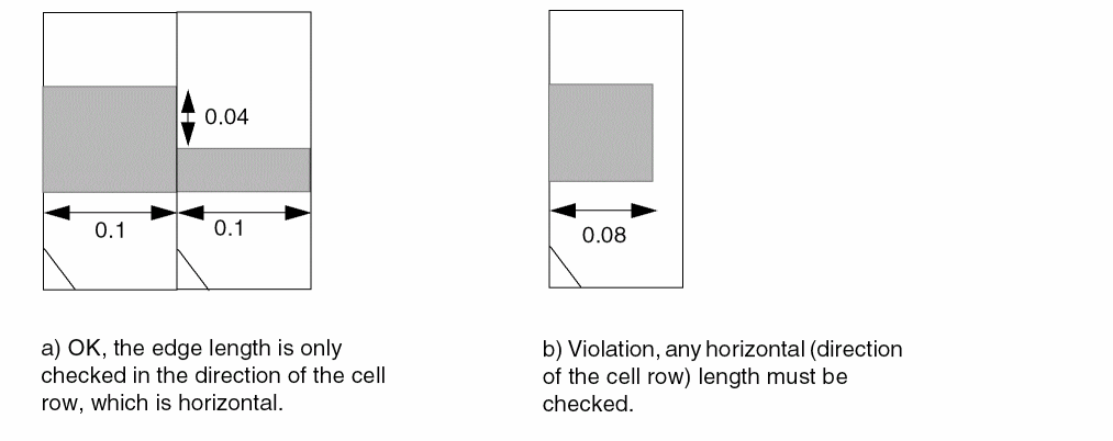 The shapes must be a rectangle with width measured in the preferred routing layer on TRIMMEDMETAL exactly equal to exactWidth and length measured in the orthogonal direction less than or equal to maxLength, if specified. Shapes are always formed at the line-end of wires on TRIMMEDMETAL. The ‘width’ dimension is always sandwiched between two line-end wires along the preferred direction on TRIMMEDMETAL.