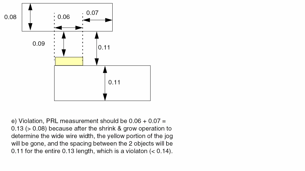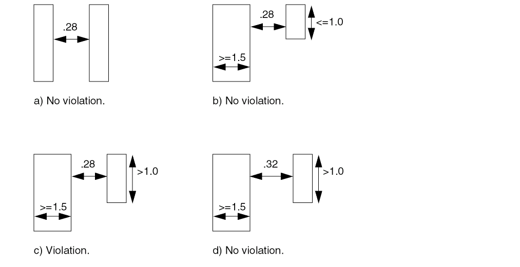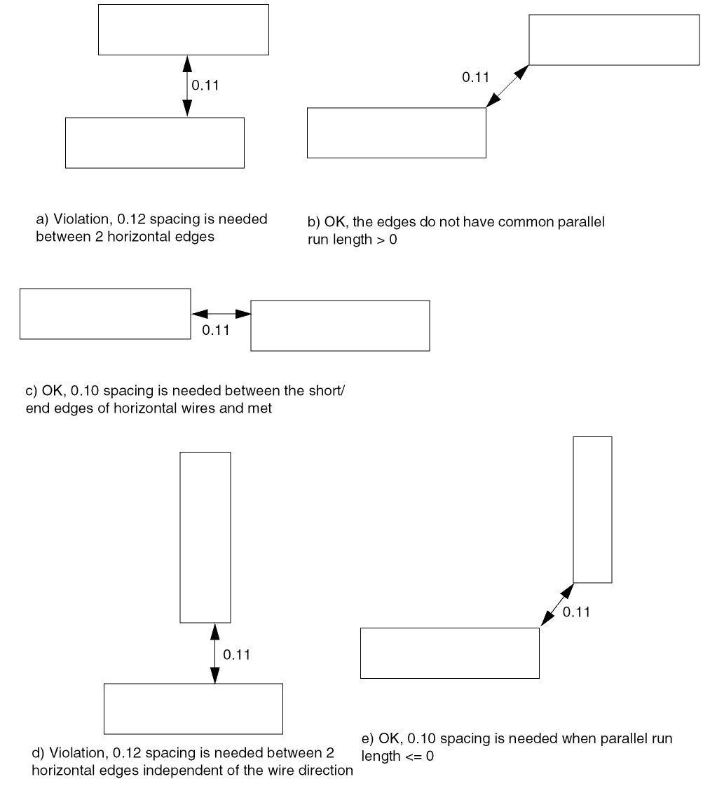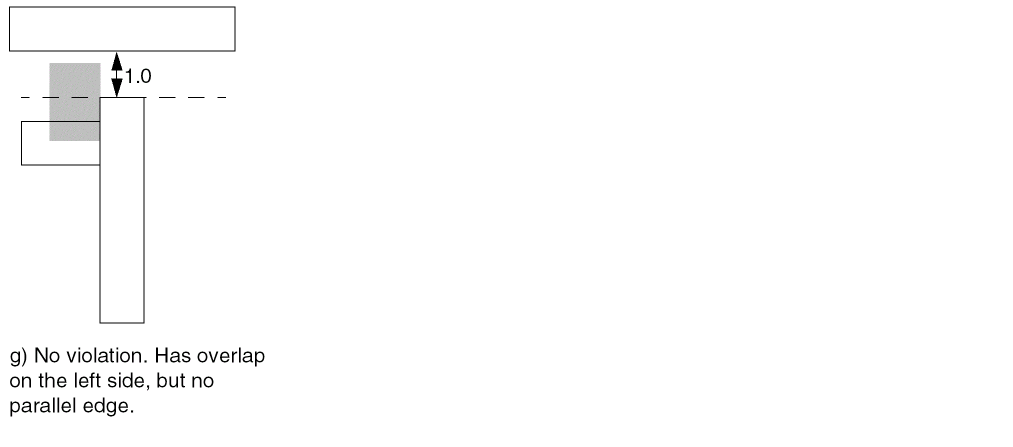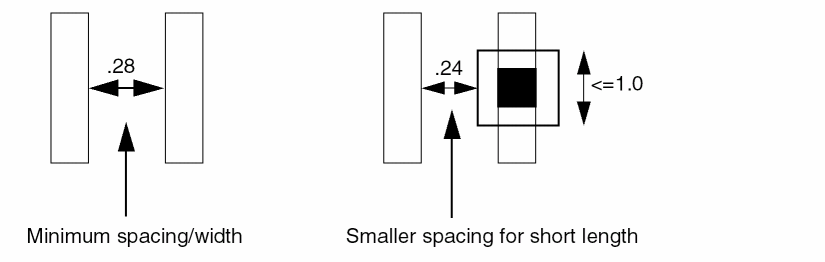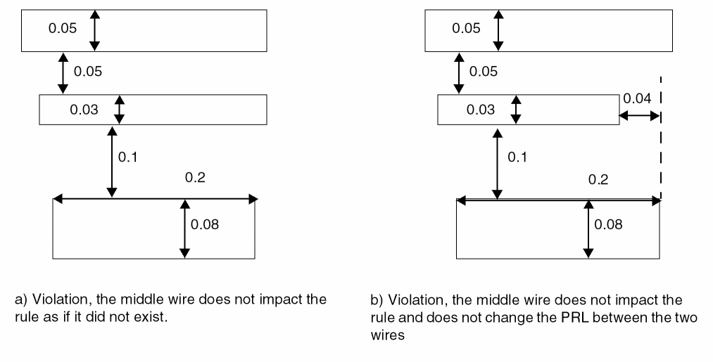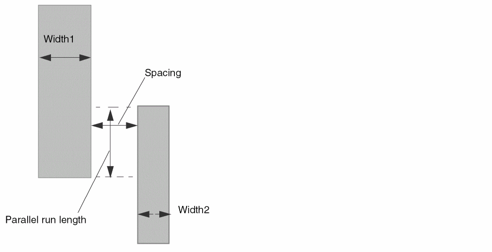 The parallel run length is measured as a sum of lengths between objects. Turning corners may break up the parallel run length thus resulting in inaccurate calculations. These are supplement spacing constraints, in addition to the regular spacing based on wire width. |