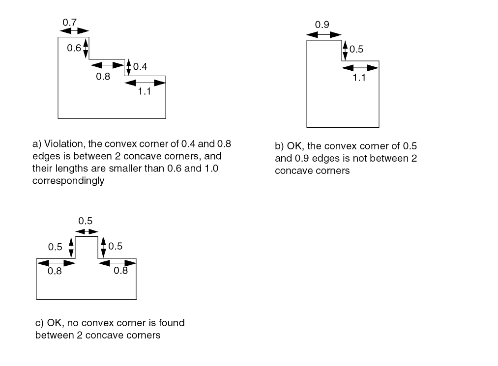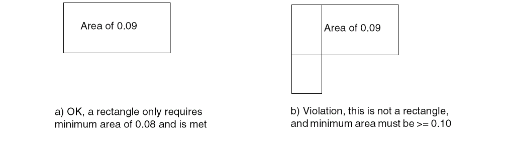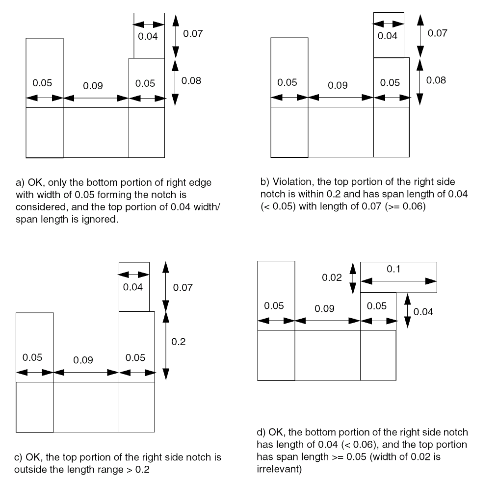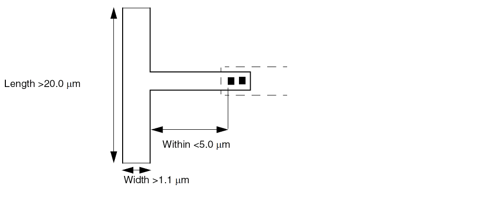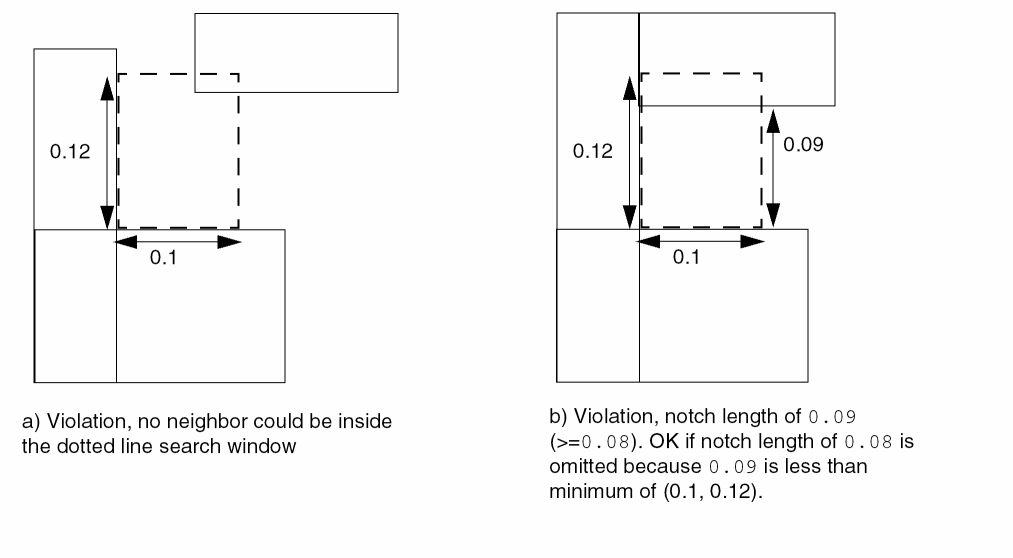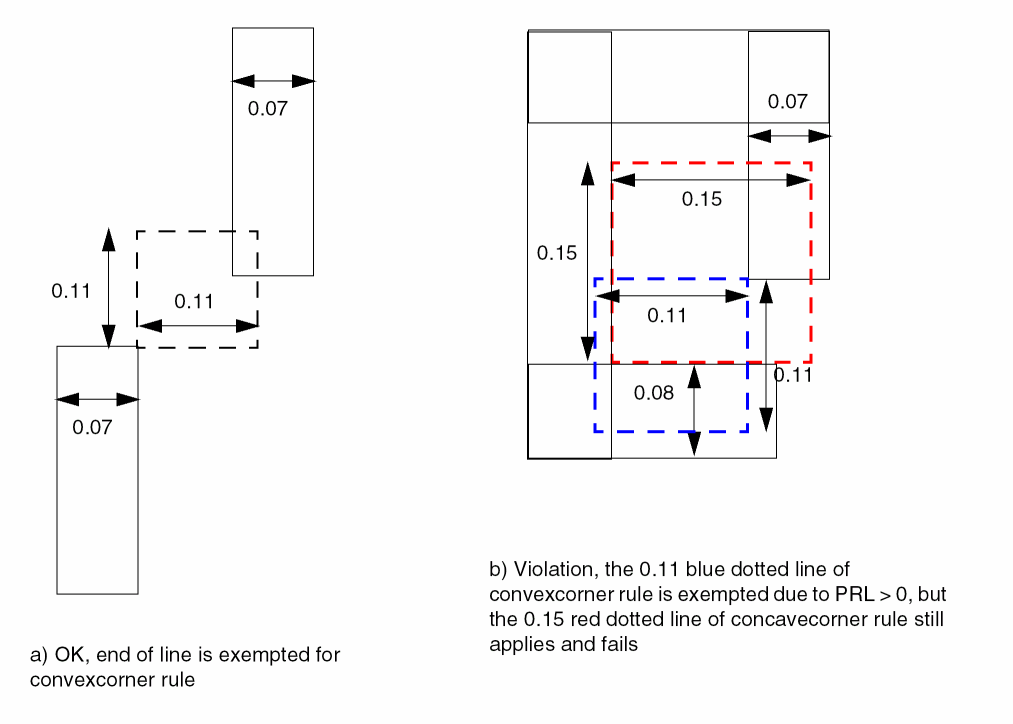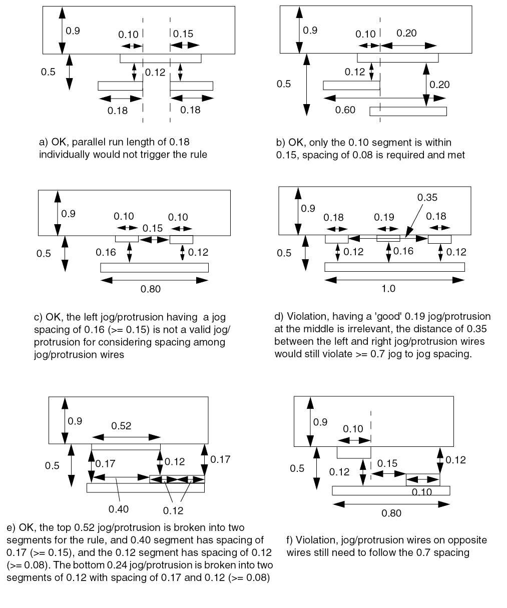 The parallel run length is measured as a sum of lengths between objects. Turning corners may break up the parallel run length thus resulting in inaccurate calculations. These are supplement spacing constraints, in addition to the regular spacing based on wire width. |