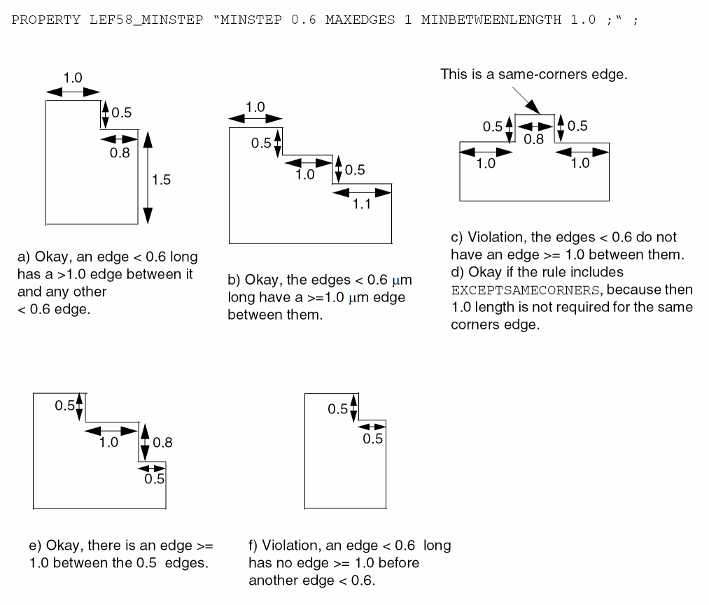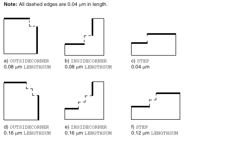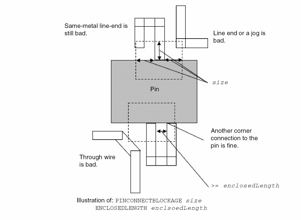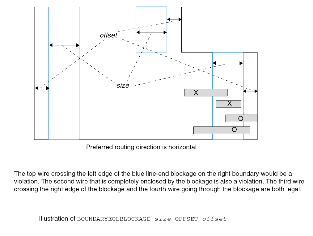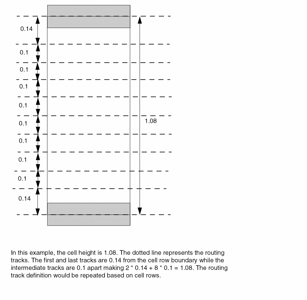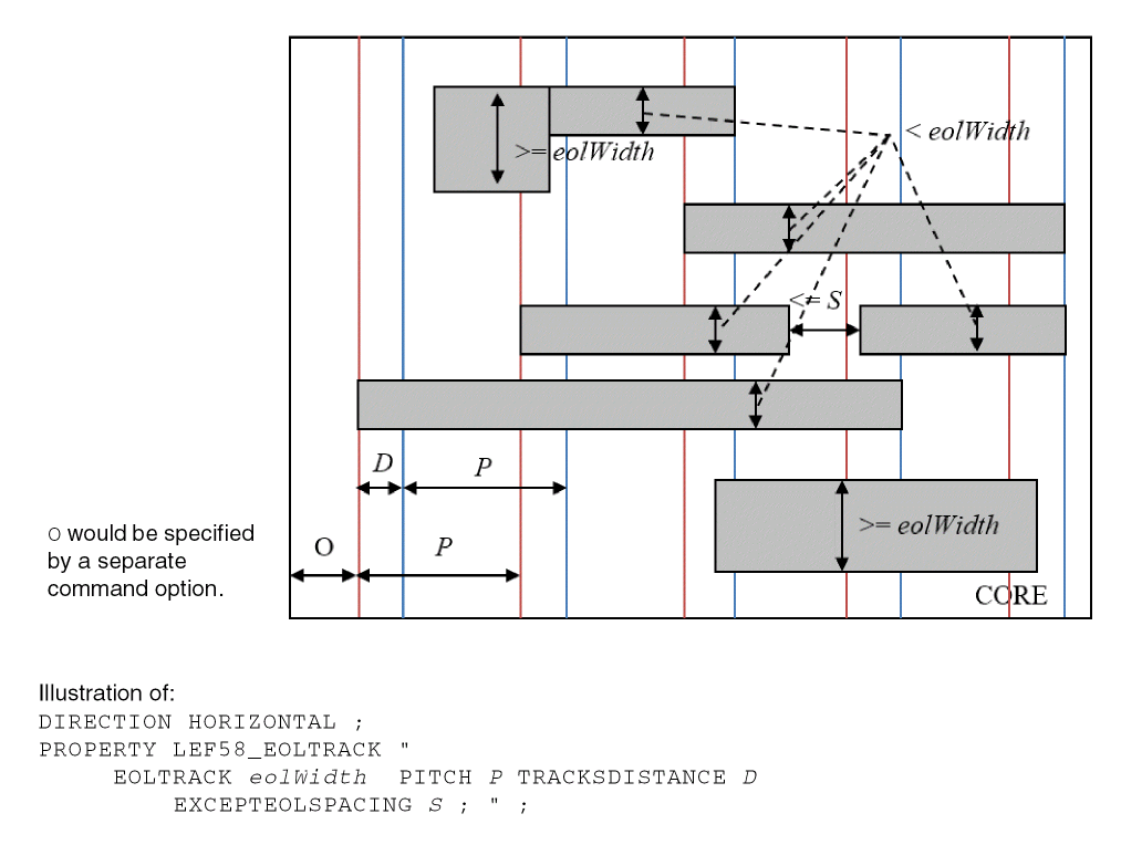 LAYERlayerNameTYPE ROUTING ; [MASKmaskNum;] DIRECTION {HORIZONTAL | VERTICAL | DIAG45 | DIAG135} ; PITCH {distance|xDistanceyDistance} ; [DIAGPITCH {distance|diag45Distancediag135Distance} ;] WIDTHdefaultWidth; [OFFSET {distance|xDistanceyDistance} ;] [DIAGWIDTHdiagWidth;] [DIAGSPACINGdiagSpacing;] [DIAGMINEDGELENGTHdiagLength;] [AREAminArea;] [MINSIZEminWidthminLength[minWidth2minLength2] ... ;] [[SPACINGminSpacing[ RANGEminWidth maxWidth[ USELENGTHTHRESHOLD | INFLUENCEvalue[RANGEstubMinWidthstubMaxWidth] | RANGEminWidth maxWidth] | LENGTHTHRESHOLDmaxLength[RANGEminWidthmaxWidth] | ENDOFLINEeolWidthWITHINeolWithin[PARALLELEDGEparSpaceWITHINparWithin[TWOEDGES]] | SAMENET [PGONLY] | NOTCHLENGTHminNotchLength| ENDOFNOTCHWIDTHendOfNotchWidthNOTCHSPACINGminNotchSpacingNOTCHLENGTHminNotchLength] ;] ... [SPACINGTABLE [PARALLELRUNLENGTH {length} ... {WIDTHwidth{spacing} ...} ... ; [SPACINGTABLE INFLUENCE {WIDTHwidthWITHINdistanceSPACINGspacing} ... ;] |TWOWIDTHS {WIDTHwidth[PRLrunLength] {spacing} ...} ... ; ] ;" ;] [WIREEXTENSIONvalue; ] [MINIMUMCUTnumCutsWIDTHwidth[WITHINcutDistance] [FROMABOVE | FROMBELOW] [LENGTHlengthWITHINdistance] ;] ... [MAXWIDTHwidth;] [MINWIDTHwidth;] [MINSTEPminStepLength[ [INSIDECORNER | OUTSIDECORNER | STEP] [LENGTHSUMmaxLength] | [MAXEDGESmaxEdges] ;] [MINENCLOSEDAREAarea[WIDTHwidth] ;] ... [PROTRUSIONWIDTHwidth1LENGTHlengthWIDTHwidth2;] [RESISTANCE RPERSQvalue;] [CAPACITANCE CPERSQDISTvalue;] [HEIGHTdistance;] [THICKNESSdistance;] [SHRINKAGEdistance;] [CAPMULTIPLIERvalue;] [EDGECAPACITANCEvalue;] [MINIMUMDENSITYminDensity;] [MAXIMUMDENSITYmaxDensity;] [DENSITYCHECKWINDOWwindowLengthwindowWidth;] [DENSITYCHECKSTEPstepValue;] [FILLACTIVESPACINGspacing;] [ANTENNAMODEL {OXIDE1 | OXIDE2 | OXIDE3 | OXIDE4 | OXIDE5 | ... | OXIDE32} ;] ... [ANTENNAAREARATIOvalue;] ... [ANTENNADIFFAREARATIO {value| PWL ( (d1r1) (d2r2) ...) } ;] ... [ANTENNACUMAREARATIOvalue;] ... [ANTENNACUMDIFFAREARATIO {value| PWL ( (d1r1) (d2r2) ...) } ;] ... [ANTENNAAREAFACTORvalue[DIFFUSEONLY] ;] ... [ANTENNASIDEAREARATIOvalue;] ... [ANTENNADIFFSIDEAREARATIO {value| PWL ( (d1r1) (d2r2) ...) } ;] ... [ANTENNACUMSIDEAREARATIOvalue;] ... [ANTENNACUMDIFFSIDEAREARATIO {value| PWL ( (d1r1) (d2r2) ...) } ;] ... [ANTENNASIDEAREAFACTORvalue[DIFFUSEONLY] ;] ... [ANTENNACUMROUTINGPLUSCUT ;] [ANTENNAGATEPLUSDIFFplusDiffFactor;] [ANTENNAAREAMINUSDIFFminusDiffFactor;] [ANTENNAAREADIFFREDUCEPWL ( (diffArea1diffMetalFactor1) (diffArea2diffMetalFactor2) ...) ;] [PROPERTYpropName propVal;] ... [ACCURRENTDENSITY {PEAK | AVERAGE | RMS} {value| FREQUENCYfreq_1 freq_2 ...; [WIDTHwidth_1 width_2 ...;] TABLEENTRIESv_freq_1_width_1 v_freq_1_width_2 ...v_freq_2_width_1 v_freq_2_width_2 ...... } ;] [DCCURRENTDENSITY AVERAGE {value| WIDTHwidth_1 width_2 ...; TABLEENTRIESvalue_1 value_2 ...} ;] [PROPERTY LEF58_ACCURRENTDENSITY "ACCURRENTDENSITY {PEAK | AVERAGE | RMS} [TEMPPWLtemp_1multi_1temp_2multi_2...] [HOURSPWLhours_1multi_1hours_2multi_2...] ; " ;] [PROPERTY LEF58_ANTENNADIFFGATEPWL "ANTENNADIFFGATEPWL {OXIDE1 | OXIDE2 | OXIDE3 | OXIDE4 | OXIDE5 | ... | OXIDE32} ((gateArea1effectiveGateArea1) (gateArea2effectiveGateArea2) ... ) ;" ;] [PROPERTY LEF58_ANTENNADIFFONLYAREARATIO “ANTENNADIFFONLYAREARATIO {OXIDE1 | OXIDE2 | OXIDE3 | OXIDE4 | OXIDE5 | ... | OXIDE32}value;..." ;] ;..." ;] [PROPERTY LEF58_ANTENNADIFFPROTECTORAREARATIO “ANTENNADIFFPROTECTORAREARATIO {OXIDE1 | OXIDE2 | OXIDE3 | OXIDE4 | OXIDE5 | ...| OXIDE32}value;..." ;] [PROPERTY LEF58_ANTENNAGATEPWL "ANTENNAGATEPWL {OXIDE1 | OXIDE2 | OXIDE3 | OXIDE4 | OXIDE5 | ... | OXIDE32} ((gateArea1effectiveGateArea1) (gateArea2effectiveGateArea2)... ) ;" ;] [PROPERTY LEF58_ANTENNAGATEPLUSDIFF "ANTENNAGATEPLUSDIFF {OXIDE1 | OXIDE2 | OXIDE3 | OXIDE4 | OXIDE5 | ... | OXIDE32} {plusDiffFactor|PWL((diffArea1plusDiffProtect1) (diffArea1plusDiffProtect2)...)} ;" ;] [PROPERTY LEF58_AREA "AREAminArea[MASKmaskNum] [EXCEPTMINWIDTHminWidth| [EXCEPTEDGELENGTH {minEdgeLengthmaxEdgeLength|edgeLength}] [EXCEPTMINSIZE {minWidthminLength}...] [EXCEPTSTEPlength1length2] | RECTWIDTHrectWidth| EXCEPTRECTANGLE | LAYERtrimLayerOVERLAP {1 | 2} ] ;..." ;] [PROPERTY LEF58_BACKSIDE “BACKSIDE ;” ;] [PROPERTY LEF58_BOUNDARYBLOCKAGE “BOUNDARYBLOCKAGEsize;” ;] [PROPERTY LEF58_BOUNDARYEOLBLOCKAGE “BOUNDARYEOLBLOCKAGEsizeOFFSEToffset[PARALLELparLengthWITHINparWithinSPACINGspacing] ;” ;] [PROPERTY LEF58_COREEOLBLOCKAGE “COREEOLBLOCKAGEoutwardSize inwardSize[SIDEEXTENSIONsideExtension] ;” ;] [PROPERTY LEF58_CORNEREOLKEEPOUT “CORNEREOLKEEPOUT WIDTHeolWidthEOLSPACINGeolSpacing{ SPACINGspacing1spacing2WITHINwithin1 within2| EXTENSIONbackwardExt sideExt forwardExt} ;” ;] [PROPERTY LEF58_CORNERFILLSPACING "CORNERFILLSPACINGspacingEDGELENGTHlength1length2ADJACENTEOLeolWidth; " ;] [PROPERTY LEF58_CORNERSPACING "CORNERSPACING {CONVEXCORNER [SAMEMASK] [CORNERONLYwithin| CORNERTOCORNER] [EXCEPTEOLeolWidth[EXCEPTJOGLENGTHlength[EDGELENGTH] [INCLUDELSHAPE]] | EOLONLYeolWidth] |CONCAVECORNER [MINLENGTHminLength] [EXCEPTNOTCH [notchLength]] } [EXCEPTSAMENET | EXCEPTSAMEMETAL] {WIDTHwidthSPACINGspacing| WIDTHwidthSPACINGhorizontalSpacingverticalSpacing}... ; " ;] [PROPERTY LEF58_ENCLOSURESPACING "ENCLOSURESPACING [CUTCLASScutClass[LONGEDGEONLY] ] [FROMABOVE | FROMBELOW] {ENCLOSUREenclosureSPACINGspacing}... ; ... " ;] [PROPERTY LEF58_ENCLOSUREWITHEOL "ENCLOSUREWITHEOLeolWidth[CUTCLASSclassName] [FROMABOVE | FROMBELOW] {ENCLOSUREenclosureEXCEPTLINEENDSPACINGspacing| {ENCLOSURESPACINGspacing enclosure}... } ; ... " ;] [PROPERTY LEF58_EOLEXTENSIONSPACING "EOLEXTENSIONSPACINGspacing[SAMEMASK] [PARALLELONLY] [NONEOL]] [OTHERWIDTHotherWidth] {ENDOFLINEeolWidthEXTENSIONextension[ENDTOENDendToEndExtension]} ... [MINLENGTHminLength[TWOSIDES]] ;" ;] [PROPERTY LEF58_EOLKEEPOUT "EOLKEEPOUT {eolWidth|minEolWidth maxEolWidth} [RIGHTWAYONLY | WRONGWAYONLY] EXTENSIONbackwardExtsideExtforwardExt[EXCEPTWITHINlowSideExthighSideExt] [CLASSclassName[OTHERENDEOL]] [CORNERONLY [EXCEPTFROM { BACKEDGE [FORWARDGAPforwardGap] [E