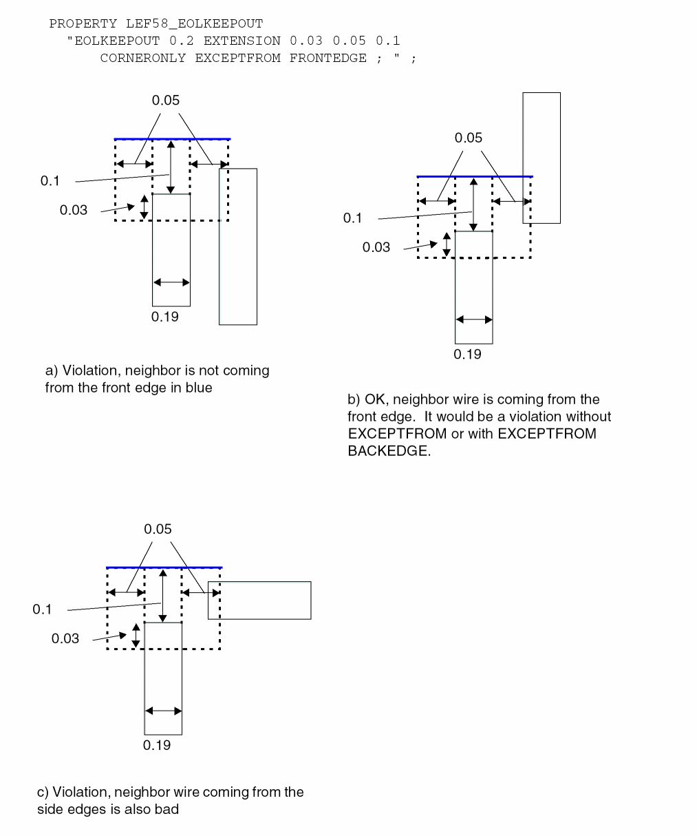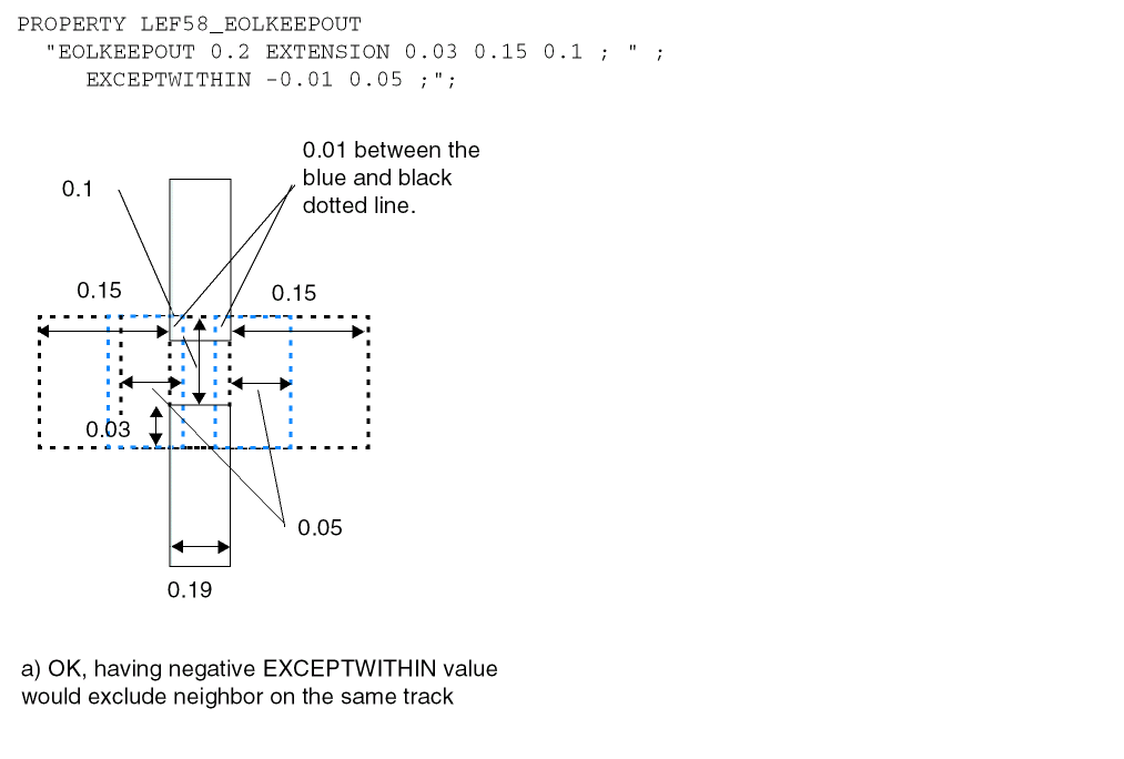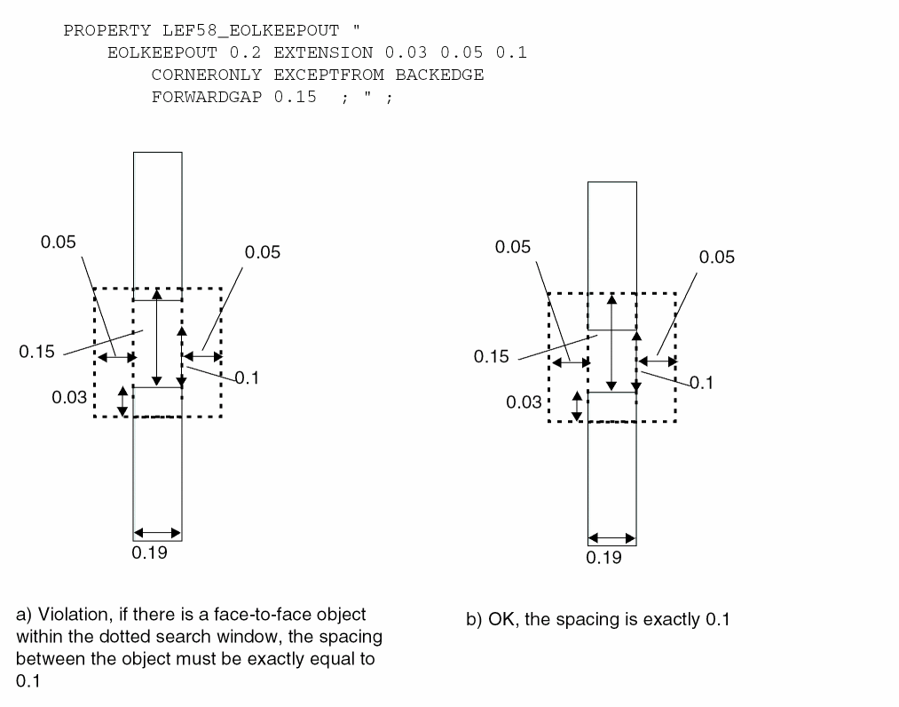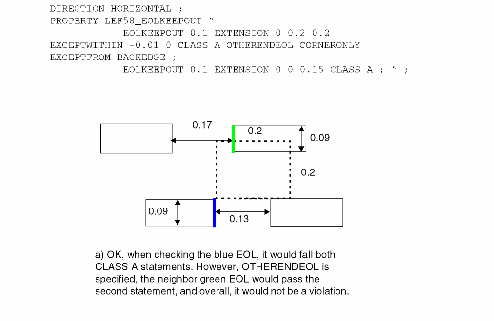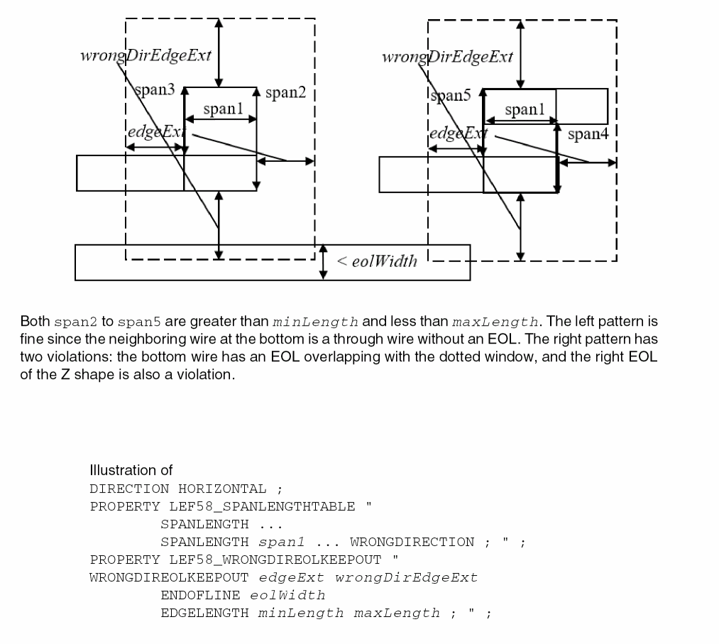 PROPERTY LEF58_WRONGDIREOLKEEPOUT "WRONGDIREOLKEEPOUTedgeExtwrongDirEdgeExtENDOFLINEeolWidthEDGELENGTHminLength maxLength;" ;