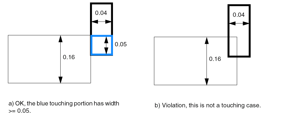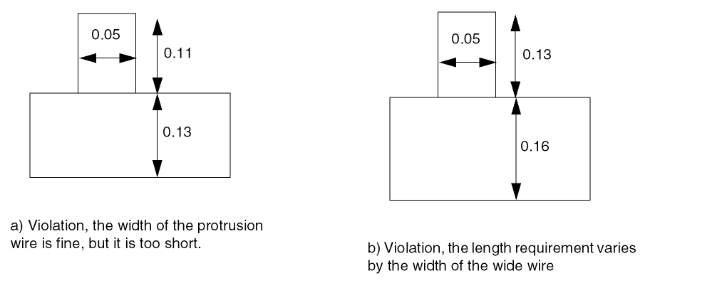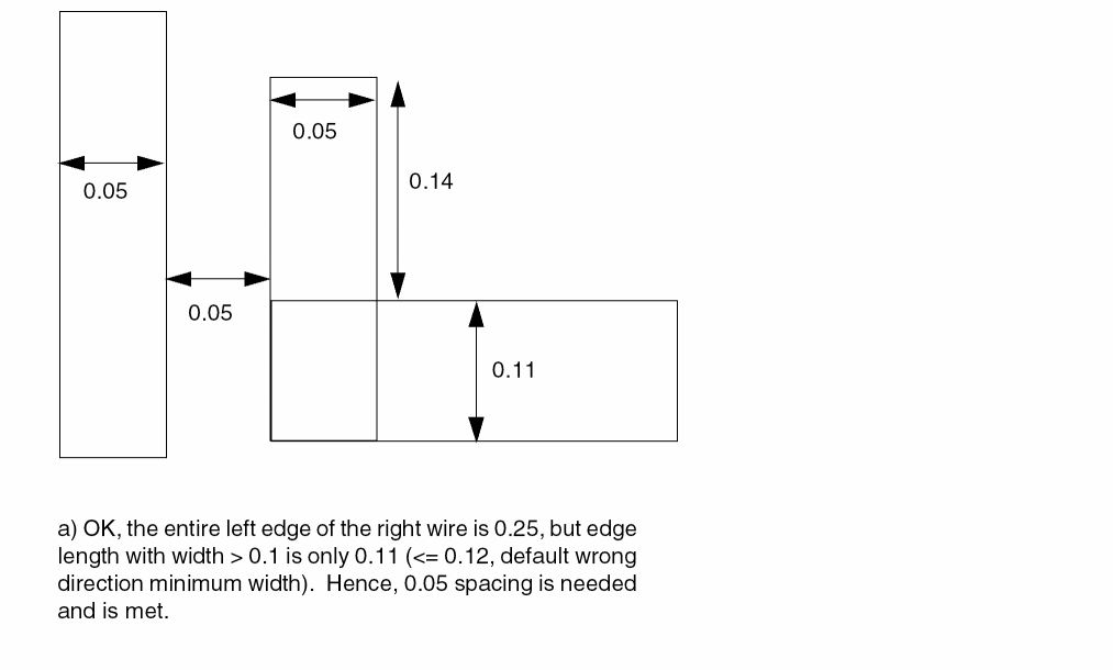 The following width table rule indicates that width must be 0.05 µm, 0.1 µm, or greater than or equal to 0.15 µm for horizontal wires.