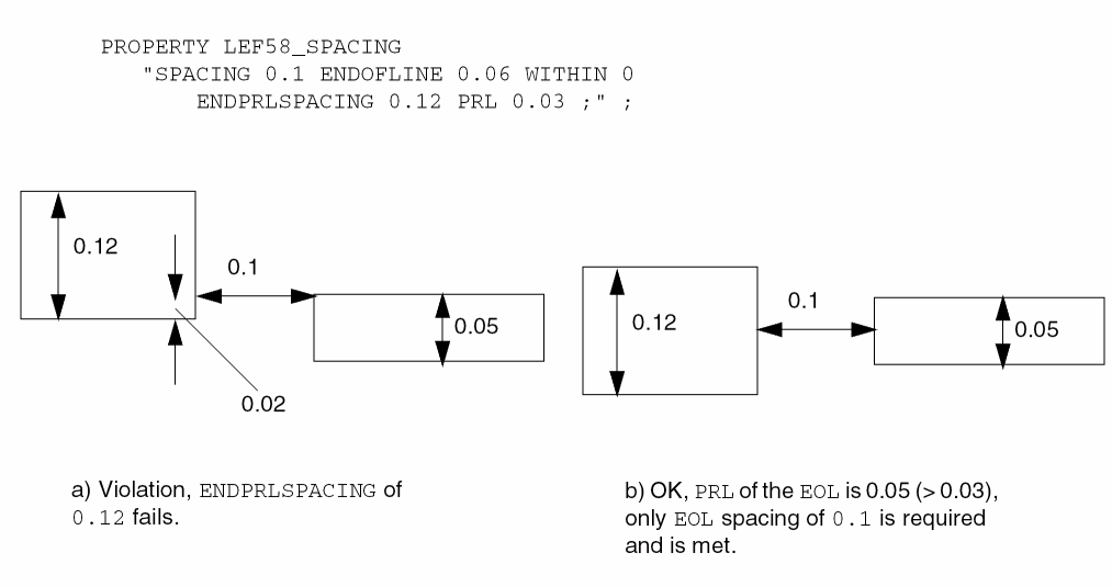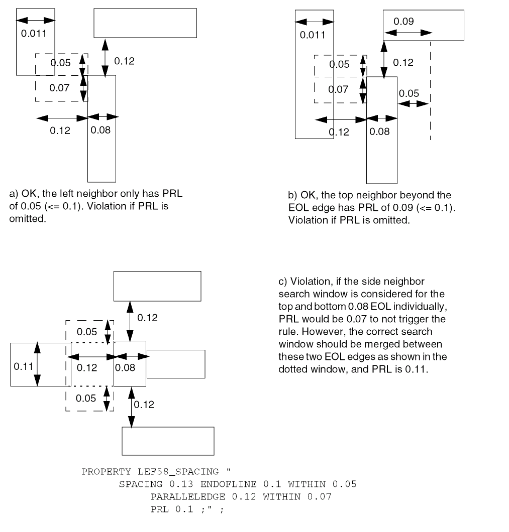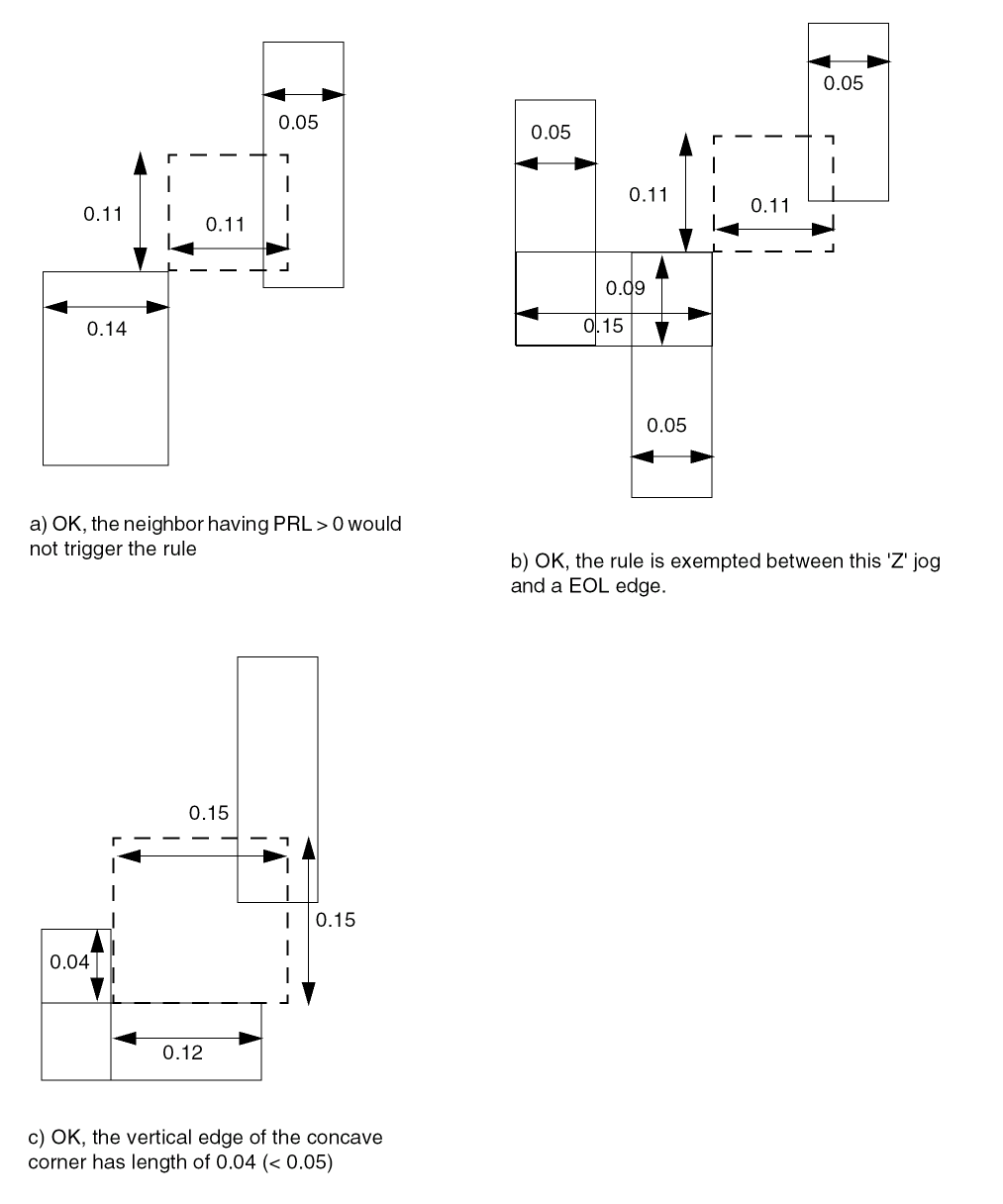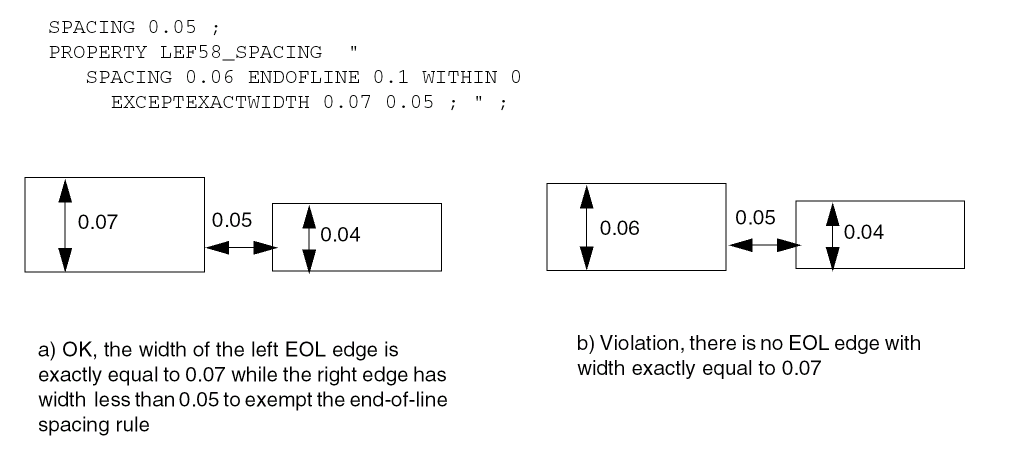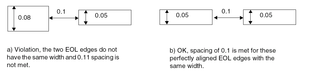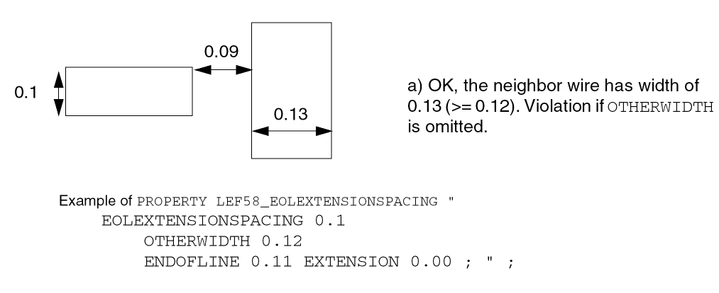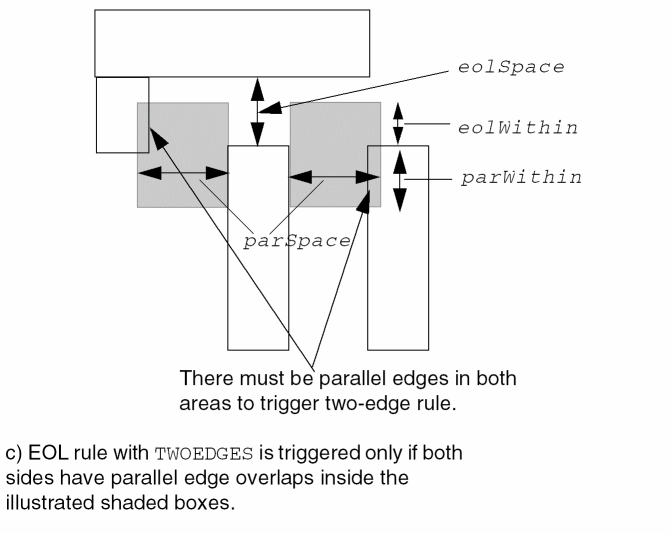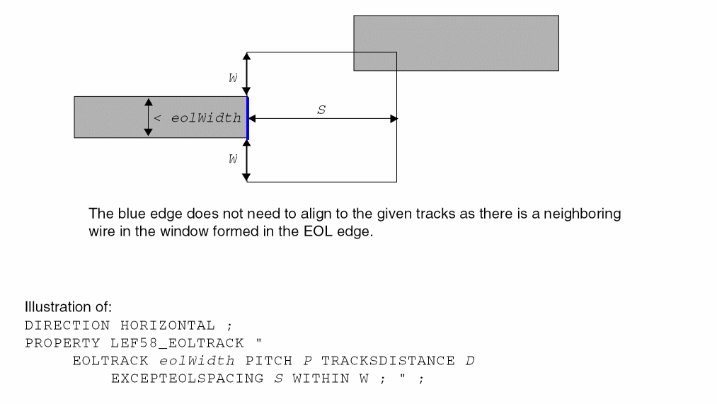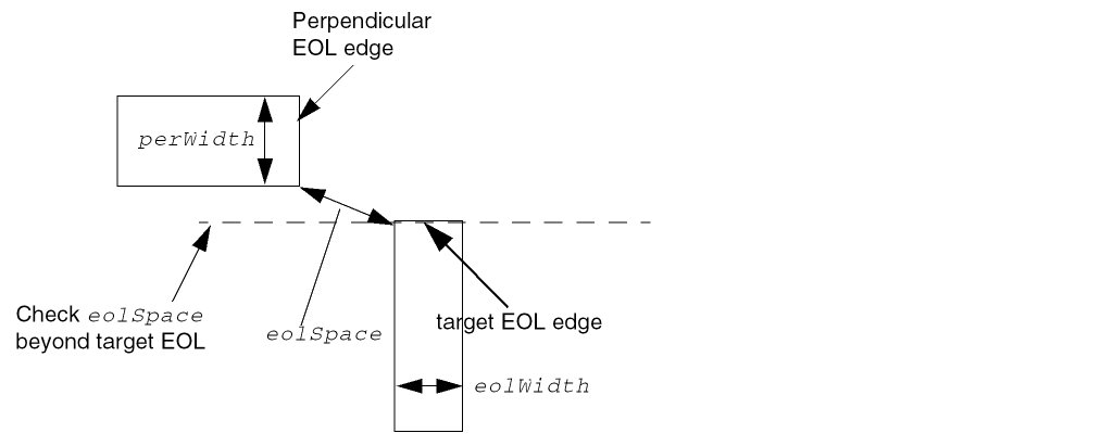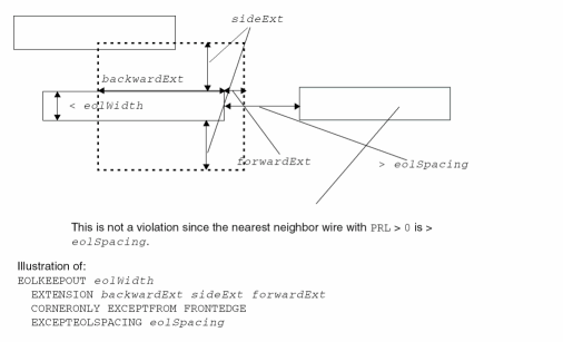 Specifies that the parallel run length table does not apply to EOL edges with width less than eolWidth. Those EOL edges should follow the |