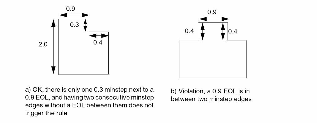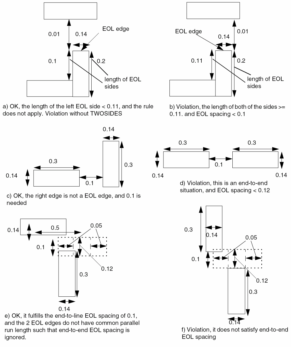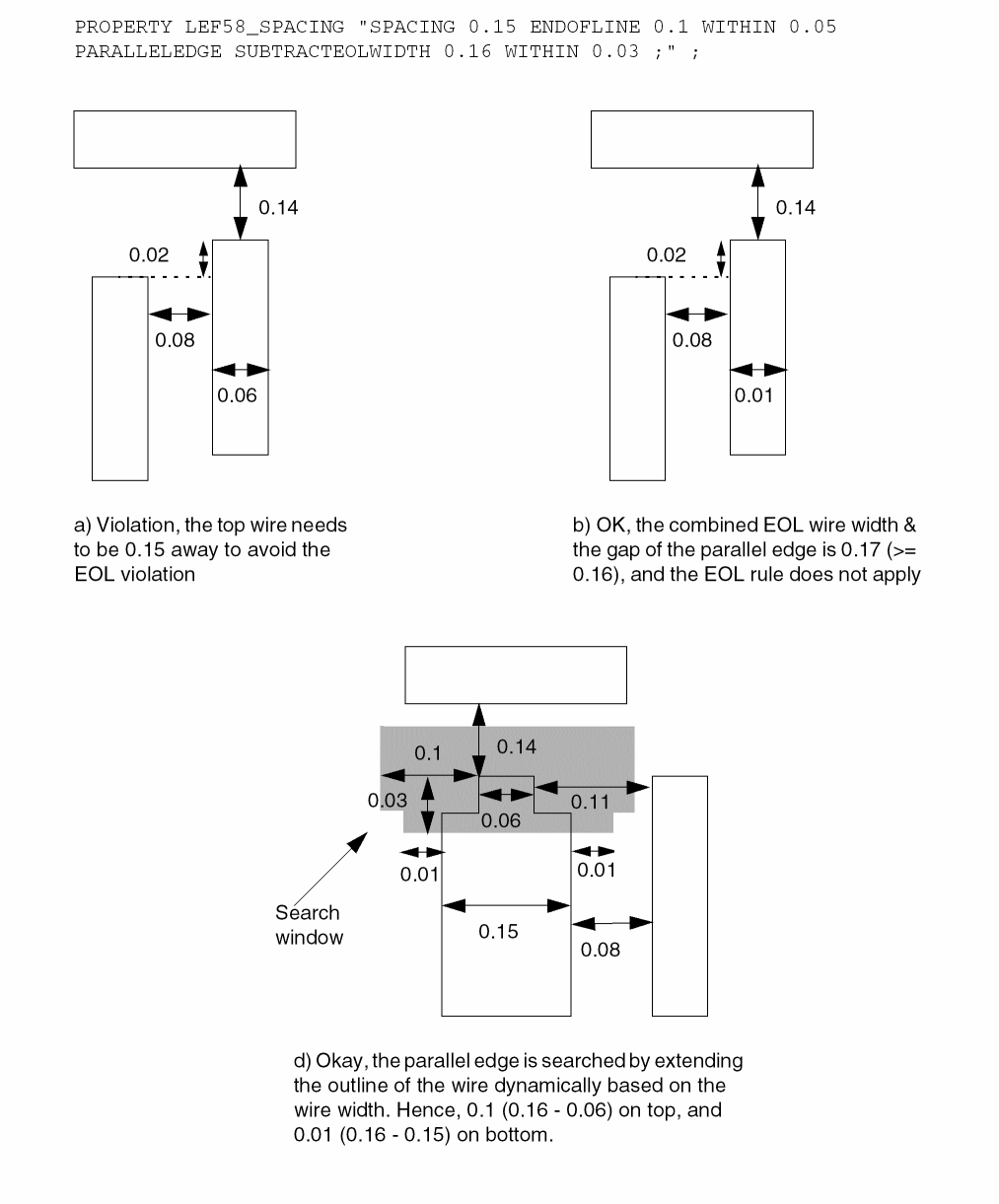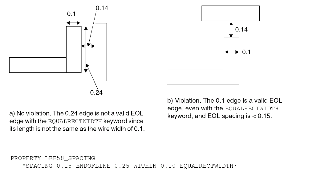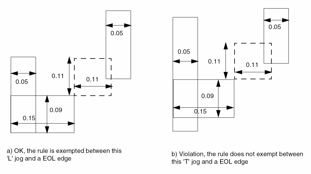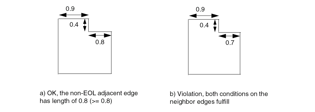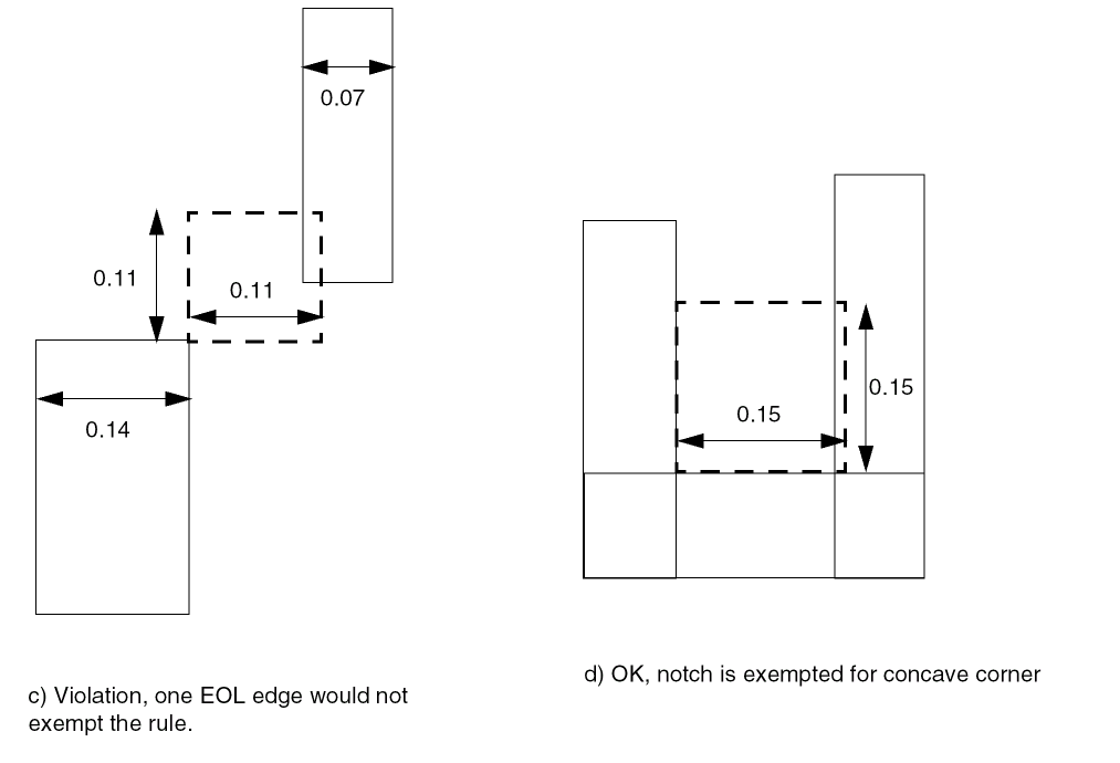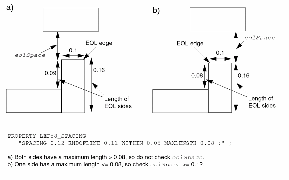 Specifies that the parallel run length table does not apply to EOL edges with width less than eolWidth. Those EOL edges should follow the |
