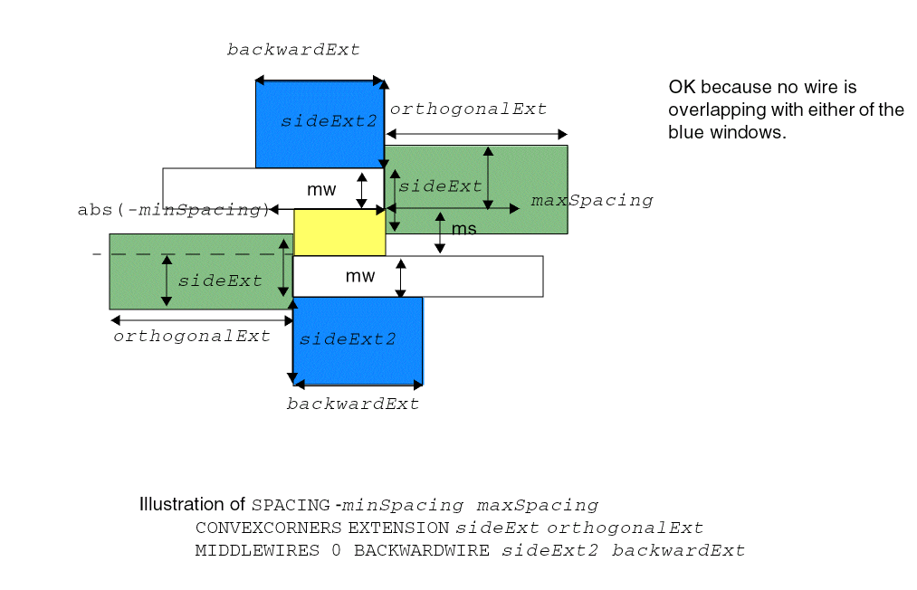PROPERTY LEF58_TWOWIRESFORBIDDENSPACING "TWOWIRESFORBIDDENSPACING [SAMEMASK | MASKmaskNum] {minSpacing maxSpacing}... [HORIZONTAL|VERTICAL] [IGNOREMIDDLE] { MINSPANLENGTHminSpanLength[EXACTSPANLENGTH] MAXSPANLENGTHmaxSpanLength[EXACTSPANLENGTH] |FIRSTSPANLENGTHspanLength1 spanLength2[OTHERSPANLENGTHotherSpanLength1] SECONDSPANLENGTHspanLength3 spanLength4} [OTHERSPANLENGTHotherSpanLength2] |OFFGRIDONLYminWidth1 maxWidth1[minWidth2 maxWidth2] } PRLprl; “ ;