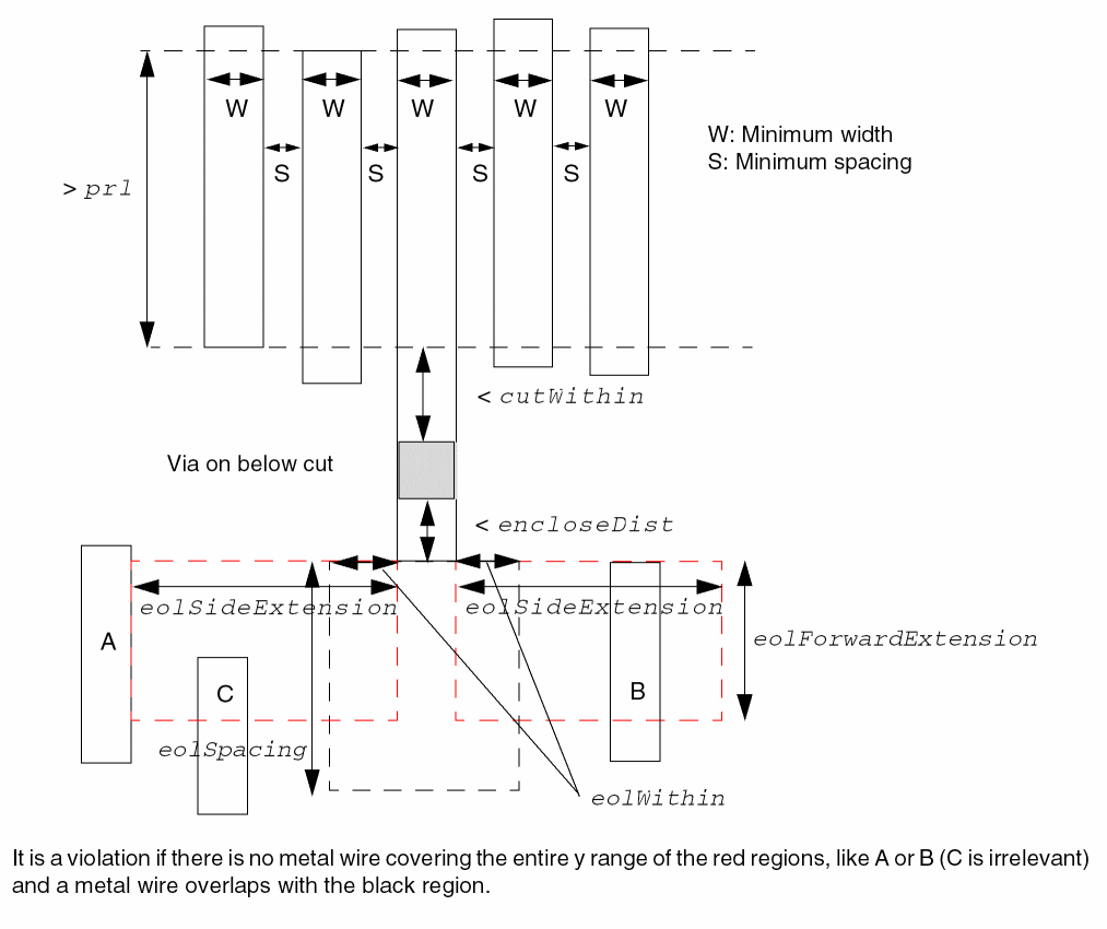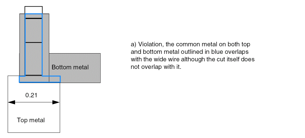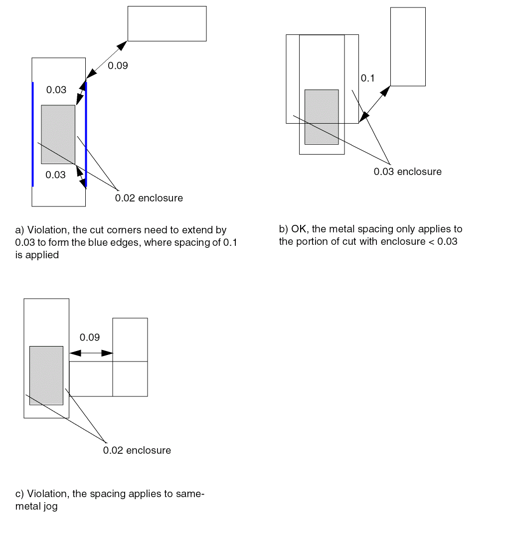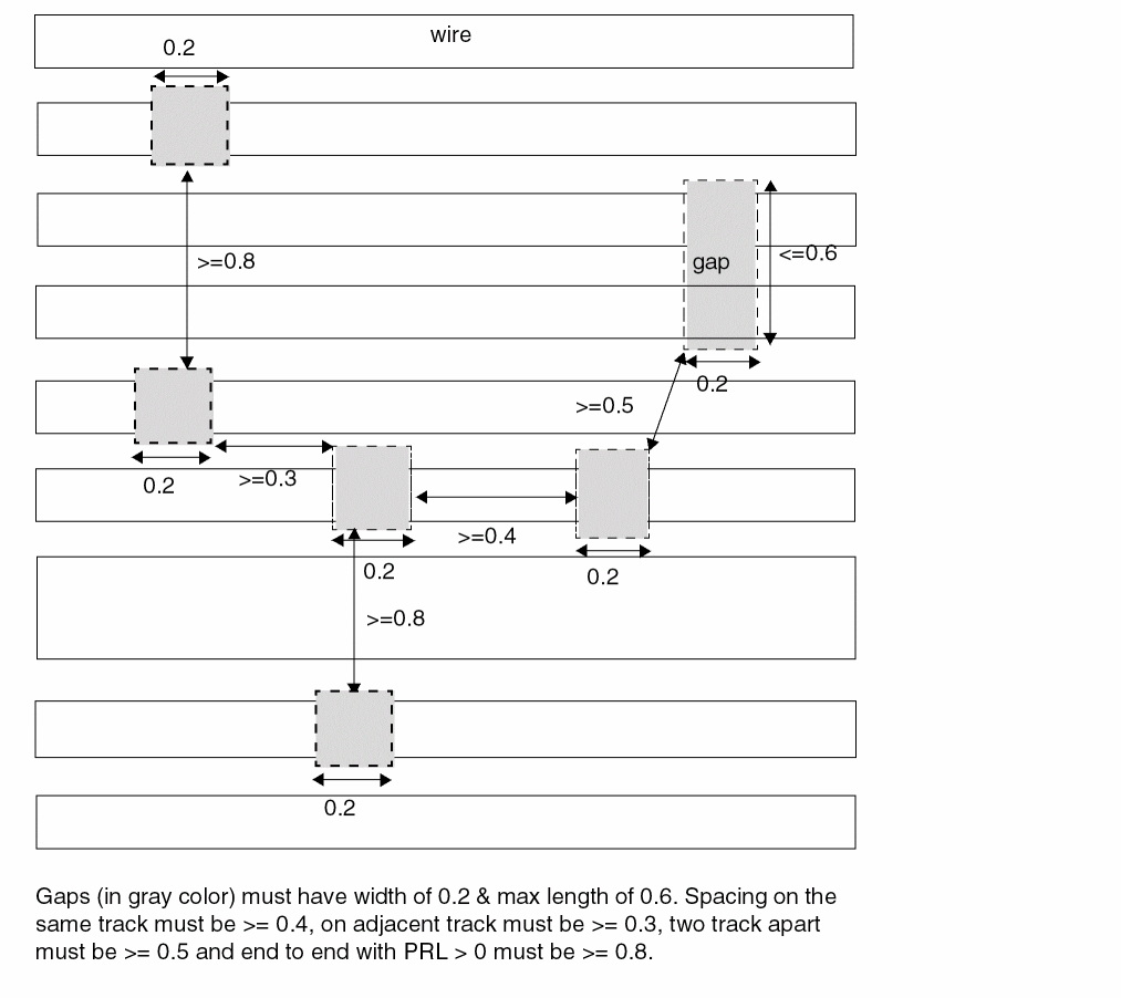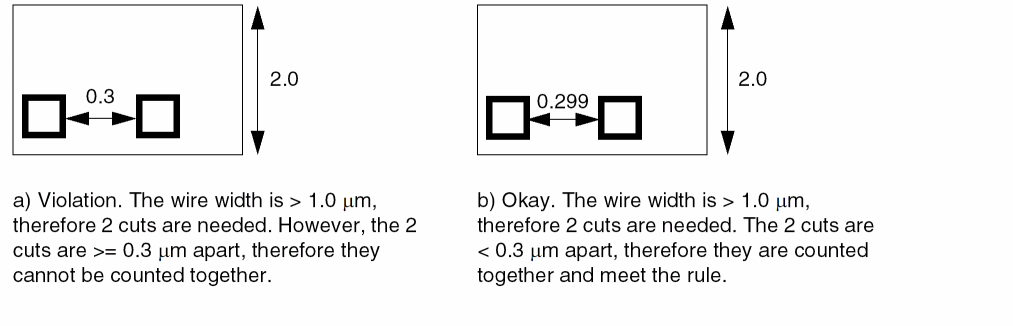 The following example indicates the same as above, except that the spacing is between wires in metal layer to all cut vias in the adjacent above and below cut layers: