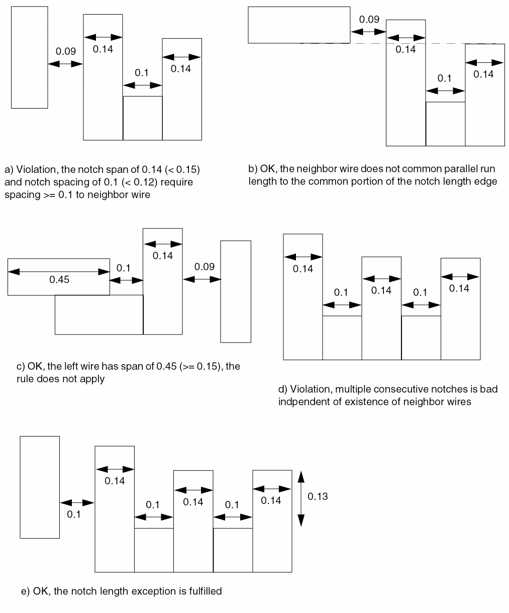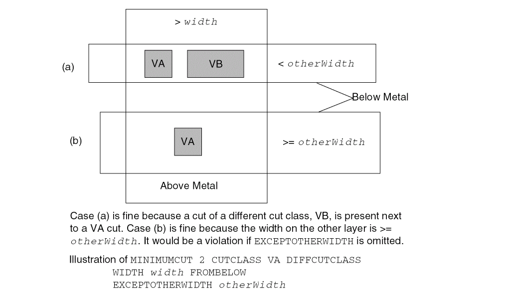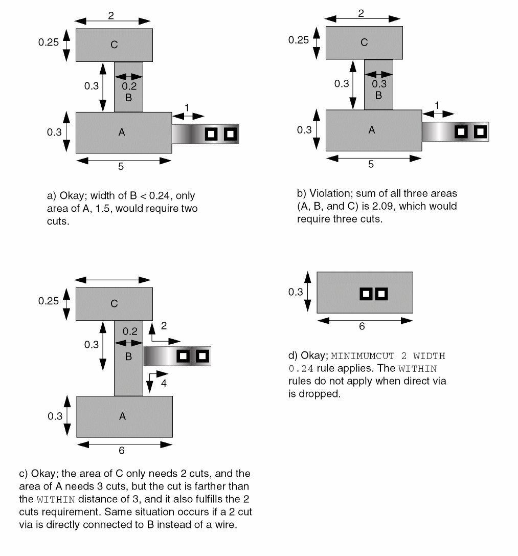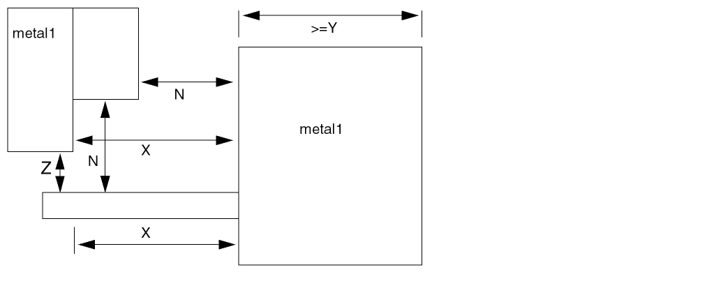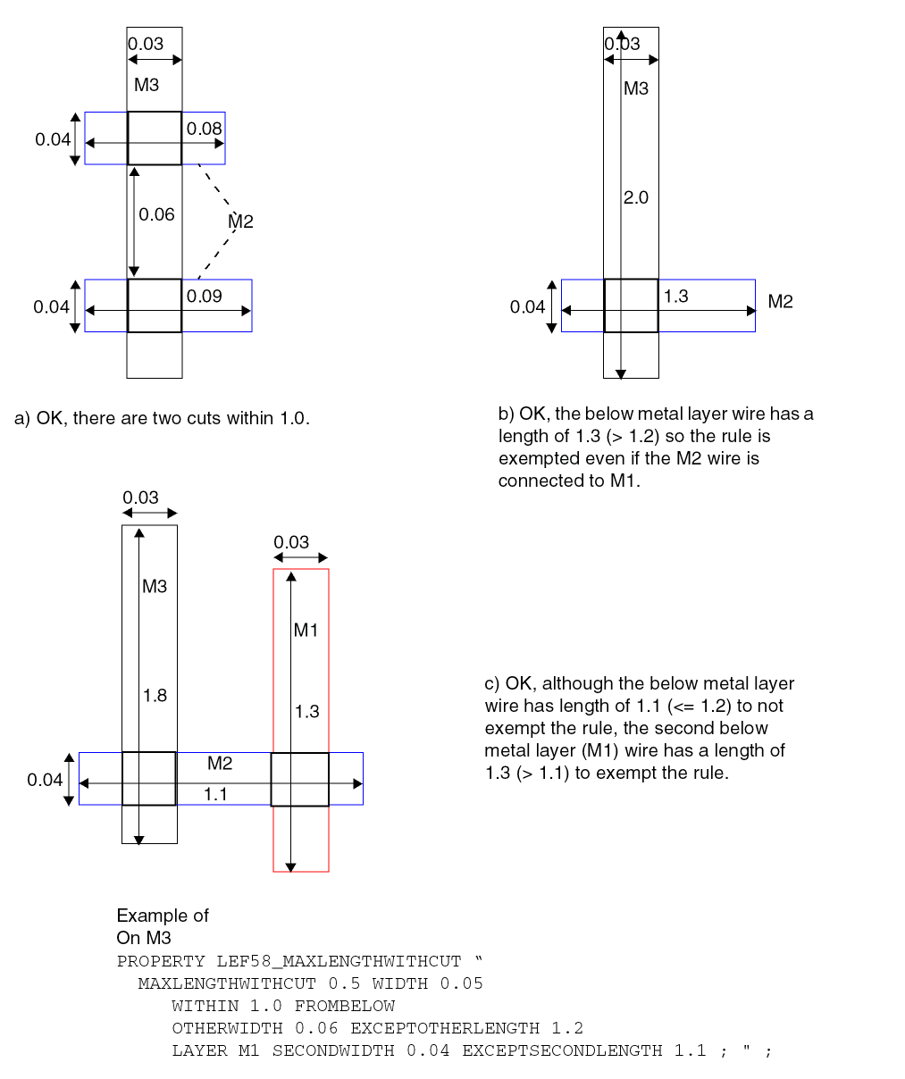 The following example indicates the same as above, except that the spacing is between wires in metal layer to all cut vias in the adjacent above and below cut layers: