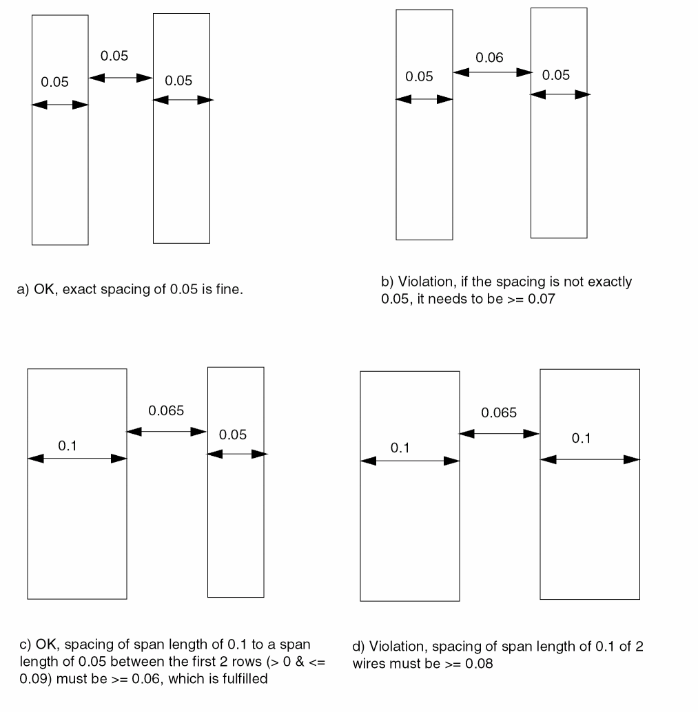 The following example indicates that 0.1 μm is the wire to wire spacing for voltage greater than or equal to 2.0V and less than 3.0V, 0.15 μm is the wire to wire spacing for voltage greater than or equal to 3.0V and less than 4.0V, and 0.2 μm is the wire to wire spacing for voltage greater than or equal to 4.0V: