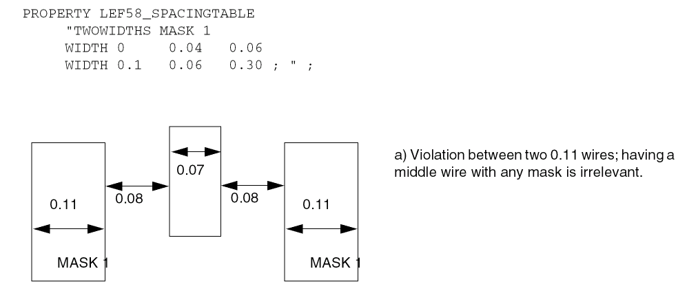 DIRECTION HORIZONTAL ; PROPERTY LEF58_TWOWIRESFORBIDDENSPACING “ TWOWIRESFORBIDDENSPACING 0.16 0.20 IGNOREMIDDLE MINSPANLENGTH 0.05 EXACTSPANLENGTH MAXSPANLENGTH 0.08 EXACTSPANLENGTH PRL 0.1 ; “ ;
