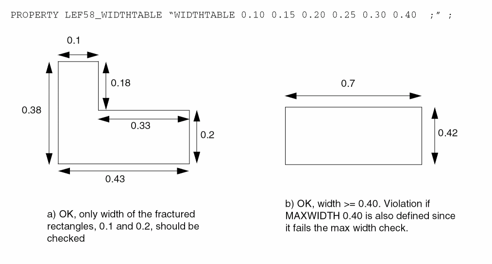 The following width table rule indicates that width must be 0.10 μm, 0.15 μm, 0.20 μm, 0.25 μm, 0.30 μm, and greater than or equal to 0.40 μm.