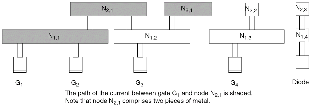 Figure C-2 shows the same section of the imaginary chip as the previous figure. The shaded areas in this figure represent the process antennas on node N2,1 and the gates to which they connect: gates G1, G2, and G3. The shaded gates discharge the electricity collected by the process antennas on node N2,1.