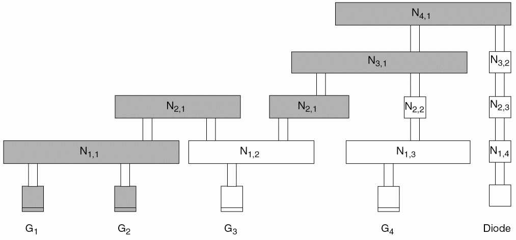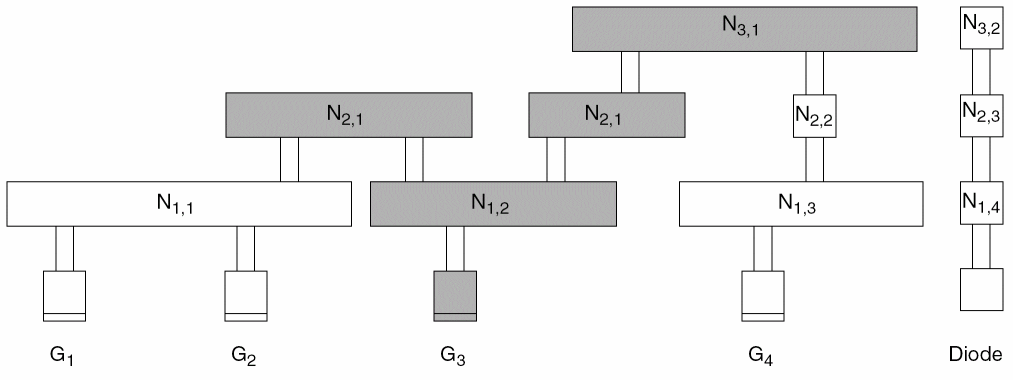 N1,1,N1,2, andN2,1would be discharged through one or more of gatesG1,G2, andG3. -
