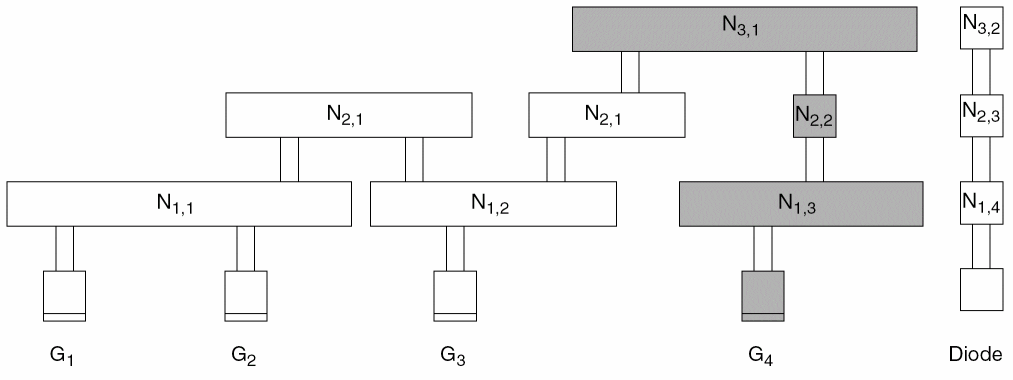 N1,3andN2,2would be discharged through gateG4. -