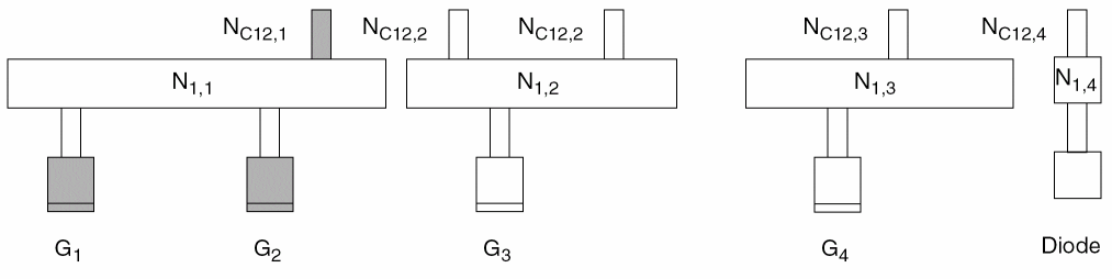 N1,1is electrically connected to gatesG1andG2. -