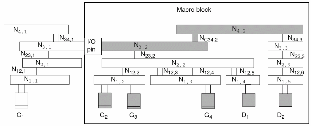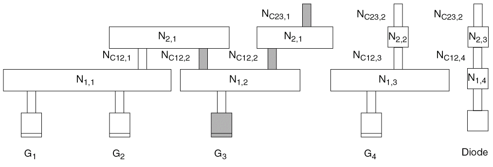 N2,1(nodeN2,1has two pieces of metal) is electrically connected to gatesG1,G2, andG3. -