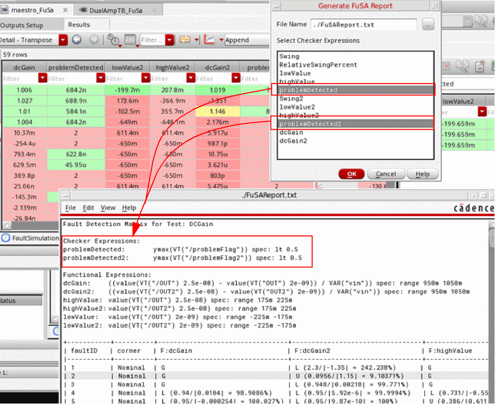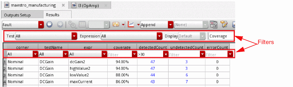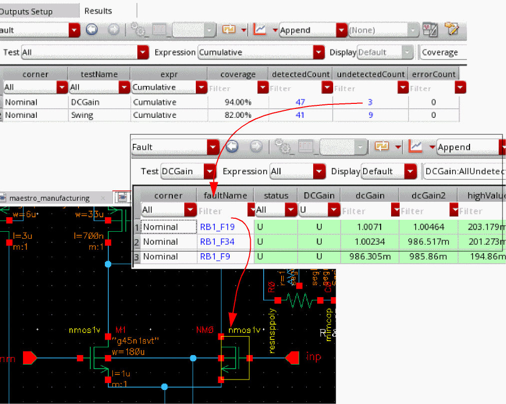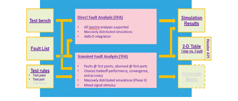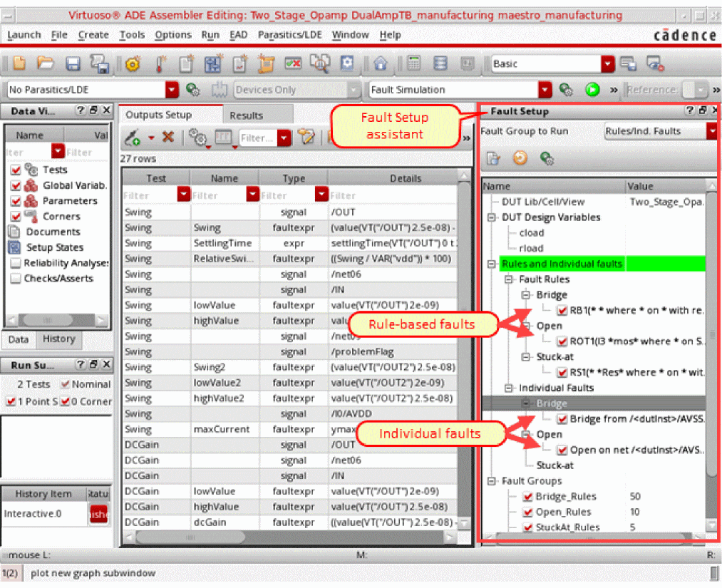 ADE Assembler provides an interactive simulation environment to create test setups, inject faults in the test designs, run the Fault Analysis using Spectre, and present the results for post-simulation analysis. Since analog designers are already familiar with ADE Assembler, running fault analysis is easy and quick.
