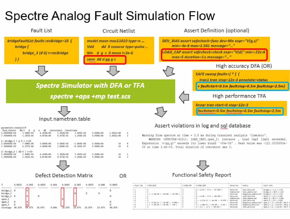 This analysis in Spectre provides a transistor-level simulation capability that can be enabled in an analog test methodology to improve test coverage by identifying critical test patterns. It is very fast in handling large numbers of faults, and also very accurate when full fault analysis precision is required. -