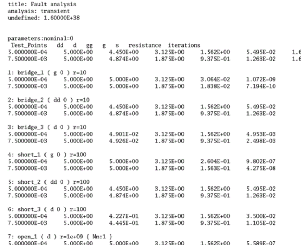 The first group with parameter nominal=0 shows the faultless result and serves as golden reference data. The signals specified in the save statement are the fault results that are printed in rows and are followed by fault resistance for bridges or opens and iteration number taken by the fault simulation to complete.