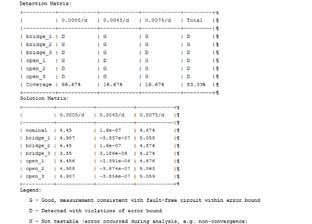 You can use the Spectre binaryspectre_ddmrpt, to evaluate the fault table file and generate the defect detection matrix. An example report is shown below.