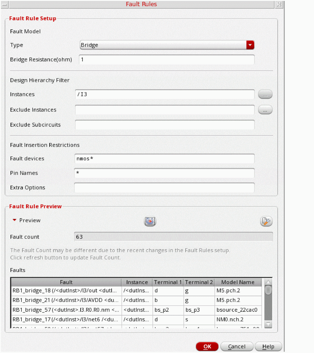 Alternatively, you can run Spectreinfoanalysis to generate the fault list based on the primitives, models, or subcircuits of a given design.