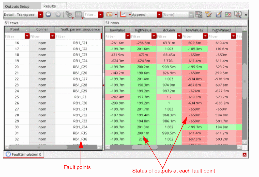 Analog fault analysis provides the capability to estimate fault coverage by generating a fault detection matrix. This matrix is obtained by comparing the faulty simulation results with nominal (faultless) data, as shown in the snapshot of the Detail-Transpose results view given below.