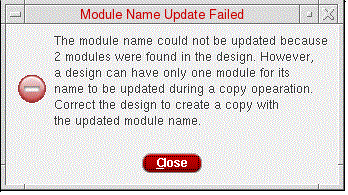 The module name does not get updated automatically if there are HDL file parsing errors or multiple modules are existing in the HDL file of the associated cell. In case the HDL file has multiple modules, copying or renaming the associated cell displays the following error message and the module name does not get updated.