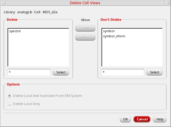 If the view is selected from a combined library, then it does not appear by default in the Delete list. It appears in the Don’t Delete list and its name indicates the physical library that it belongs to. If you want to delete the view, move it to the Delete list. In addition, the view gets deleted from the physical library to which it belongs.If the view is part of a combined cell, that is, a cell that is found in more than one library in the combined library, the Don’t Delete list displays an entry for each library, so that you can select the ones you want to delete. However, if the cell is a part of the top-level combined library, then the view does appear in the Delete list and all the other views of that cell are displayed in the Don’t Delete list. - To delete additional views, you need to select a view from the Don’t Delete list box and click the left-facing Move arrow to move the selected views to the Delete list box.