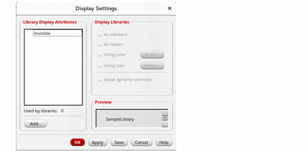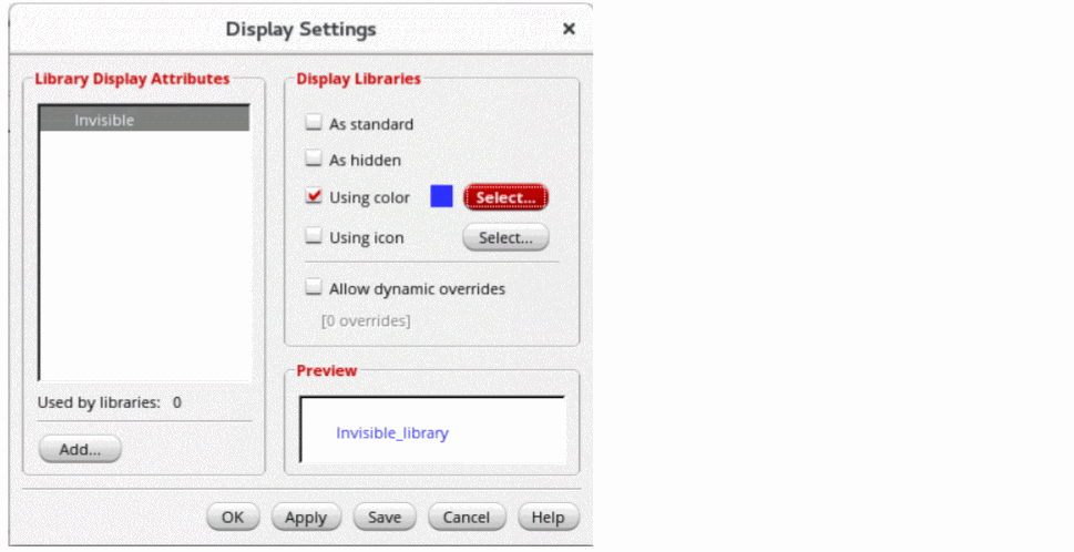 The new or modified attribute definitions are saved in the current_working_dir/.cadence/libManager/displayPrefs file. If this file does not exist, it is created. If you clicked Save, your changes are saved to this file immediately; if you clicked OK or Apply, the file is updated when you exit the Library Manager.