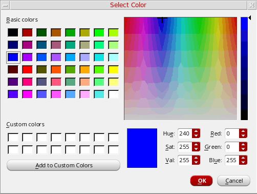 - Choose a color from the Basic colors or Custom colors table, or create a custom color by moving the cross in the color spectrum to the color you want and then clicking Add to Custom Colors.