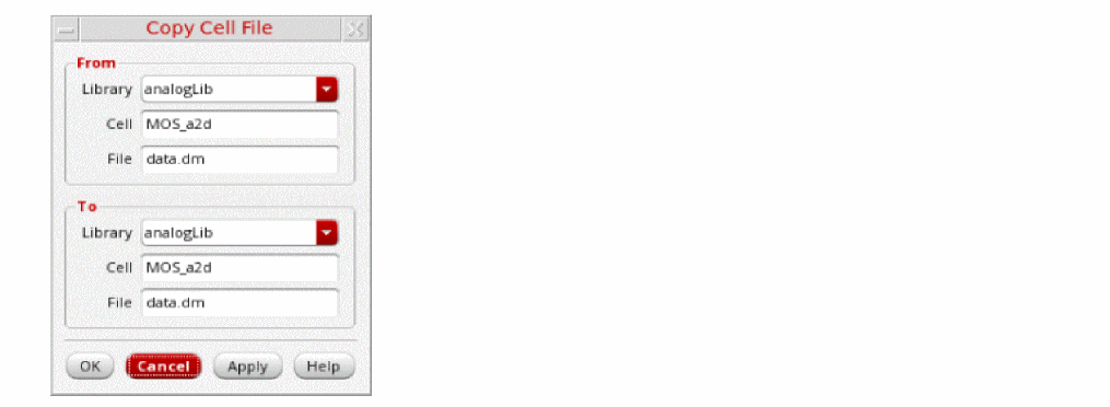 The Copy Cell File form appears.The selected cell file appears in the Library, Cell, and File fields in the From group box. It also appears in the Library, Cell, and File fields in the To group box. You can change any or all of these values.